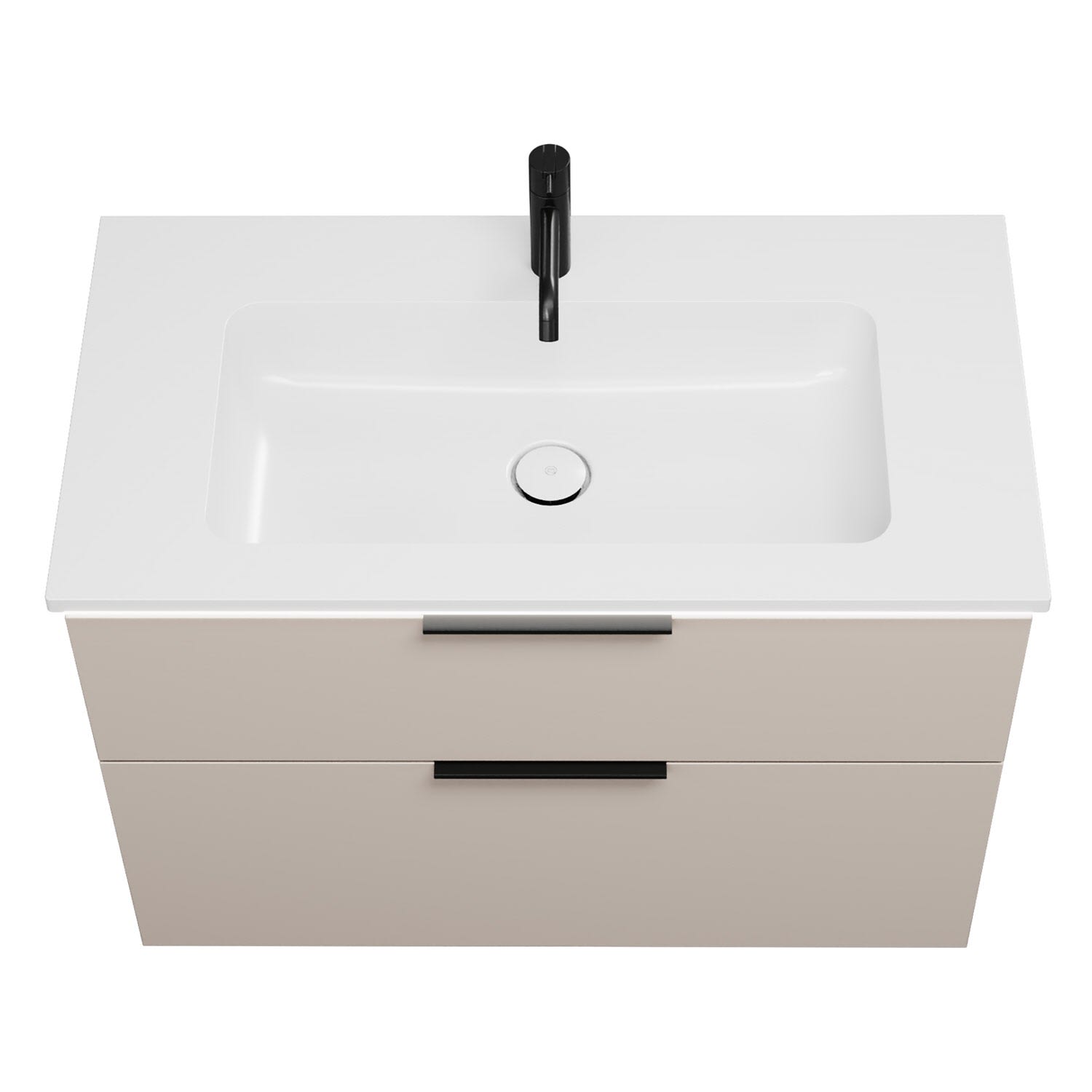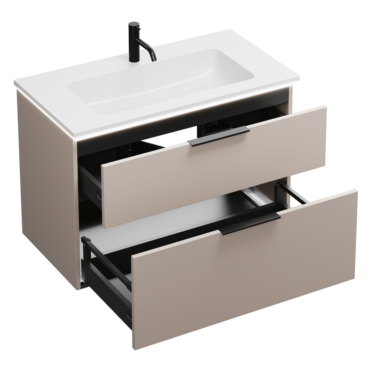 - 1 Schublade oben, 35 cm tief, mit Siphonausschnitt und Inneneinteilung