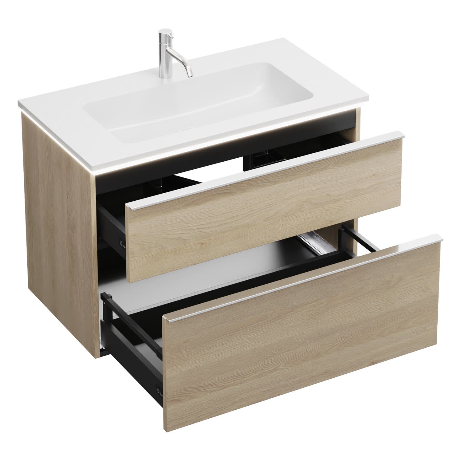 - 1 Schublade oben, 35 cm tief, mit Siphonausschnitt und Inneneinteilung
