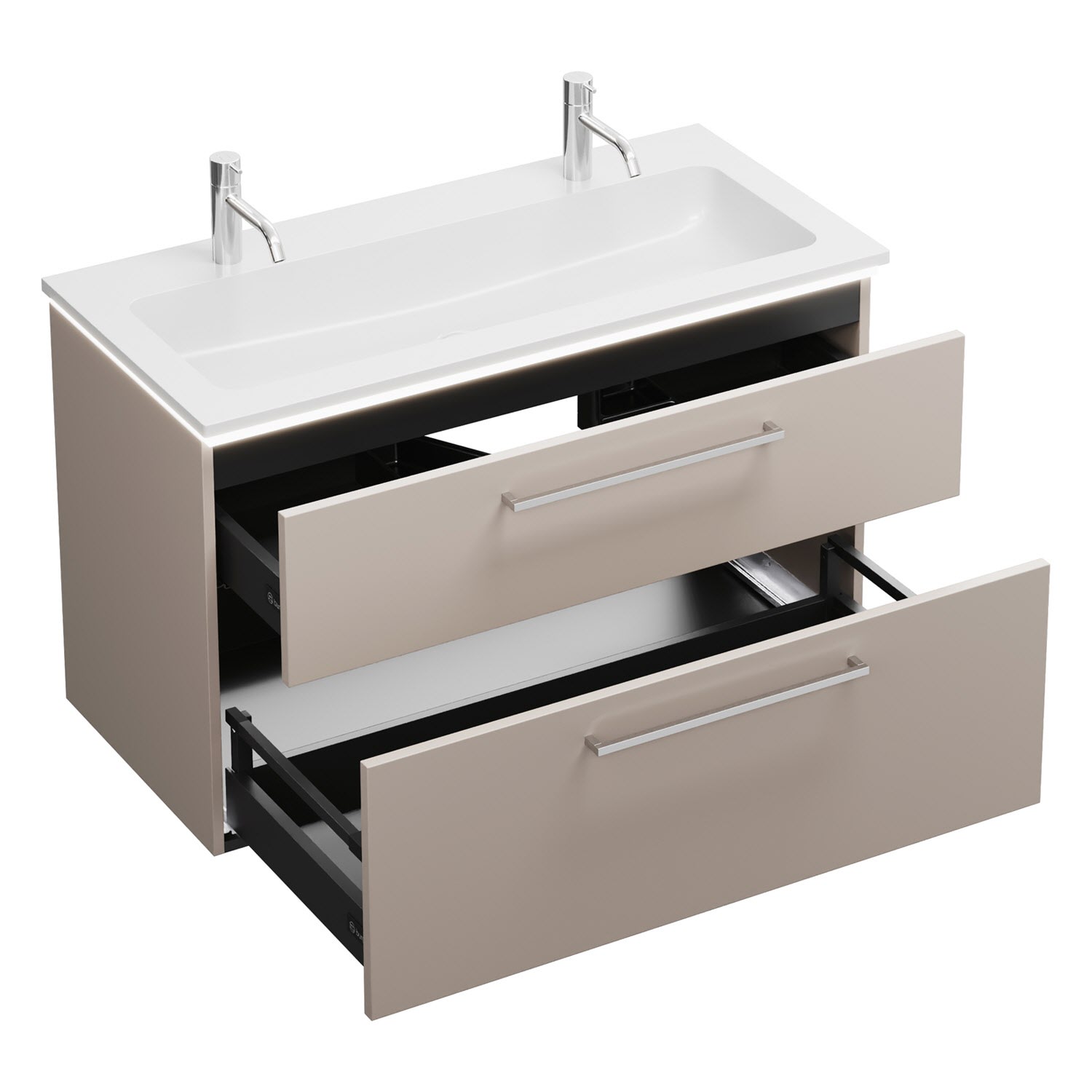 - 1 Schublade oben, 35 cm tief, mit Siphonausschnitt und Inneneinteilung