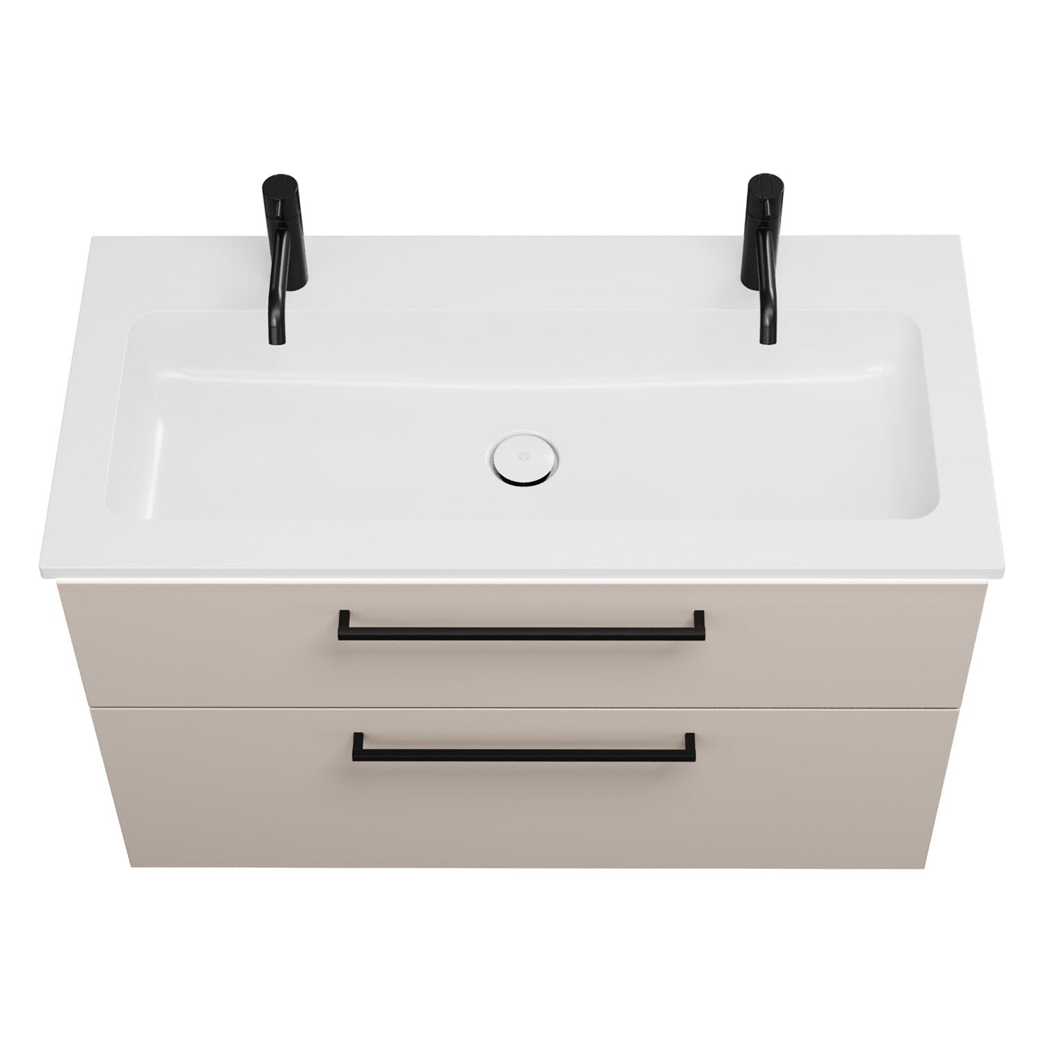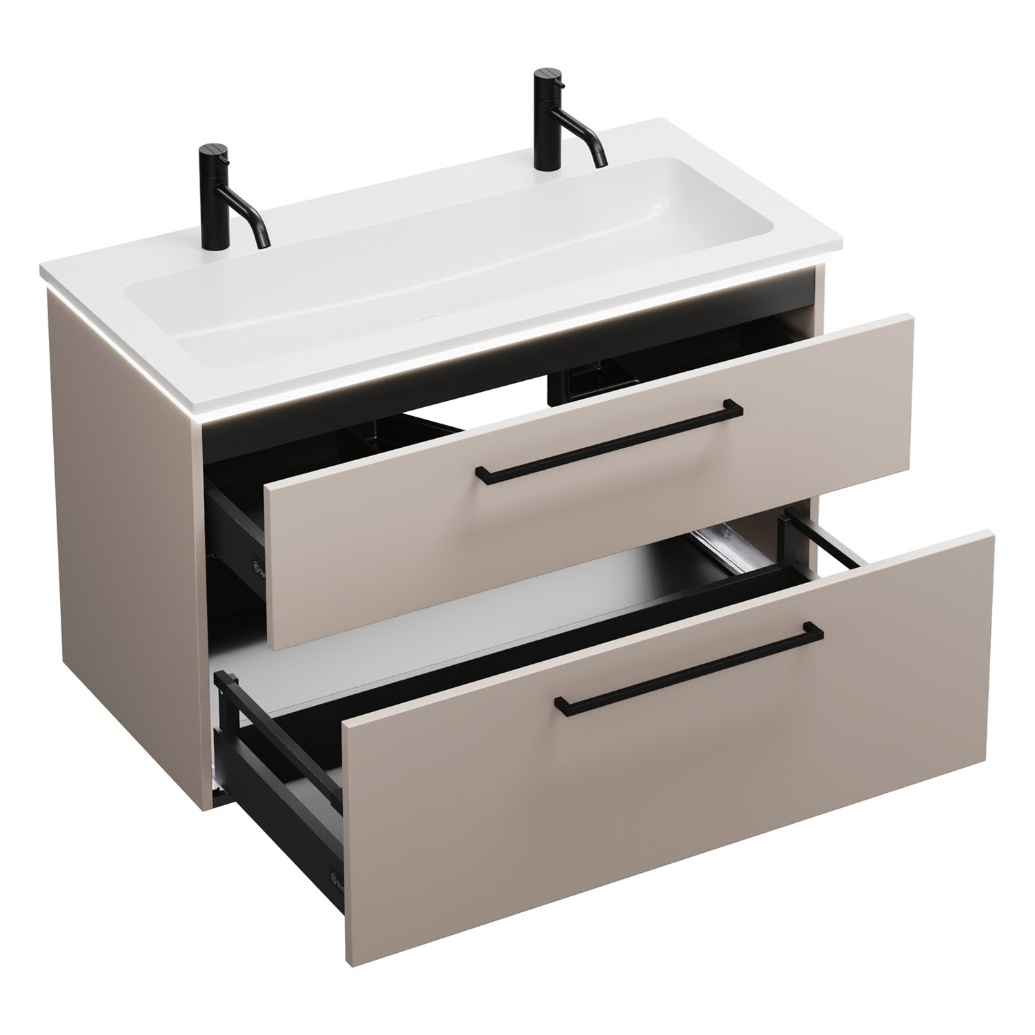 - 1 Schublade oben, 35 cm tief, mit Siphonausschnitt und Inneneinteilung