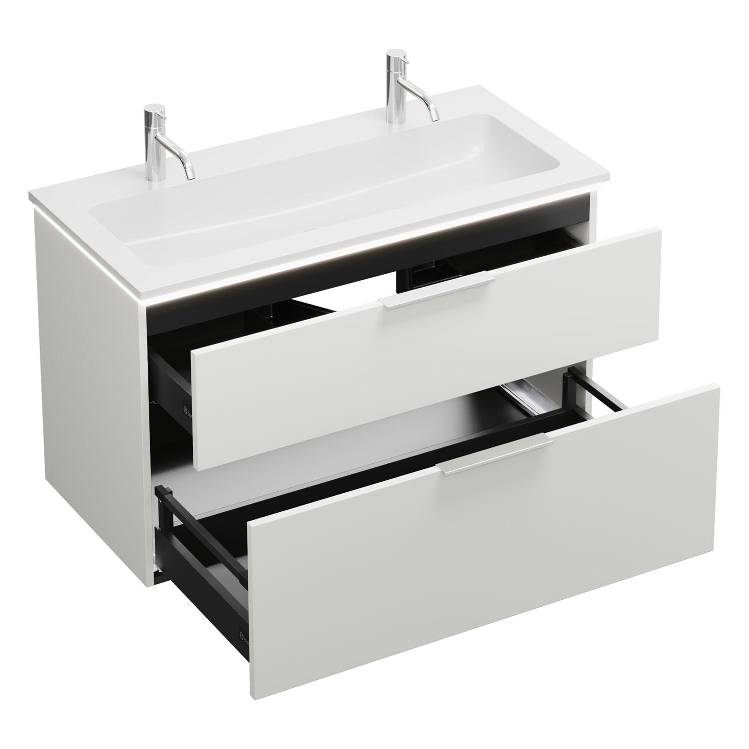 - 1 Schublade oben, 35 cm tief, mit Siphonausschnitt und Inneneinteilung