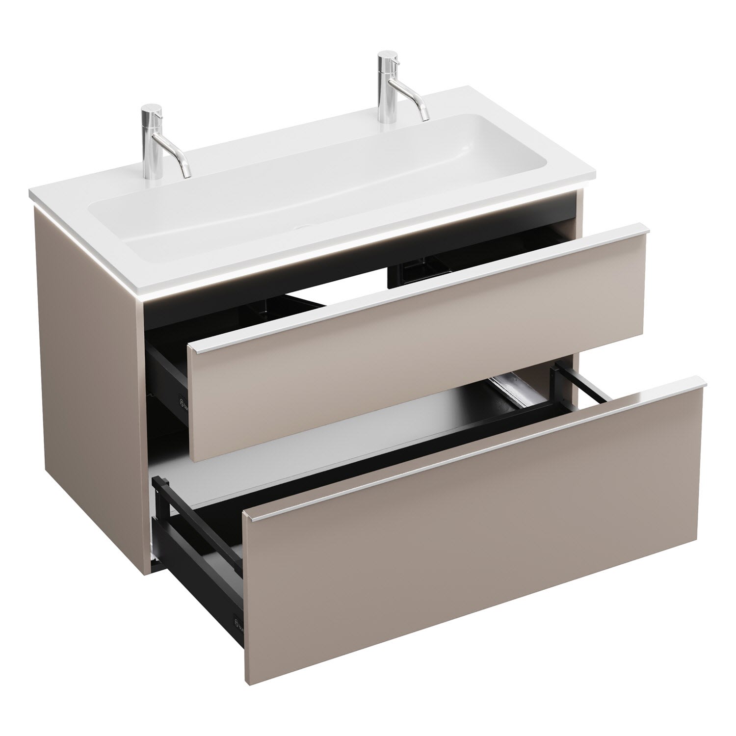 - 1 Schublade oben, 35 cm tief, mit Siphonausschnitt und Inneneinteilung