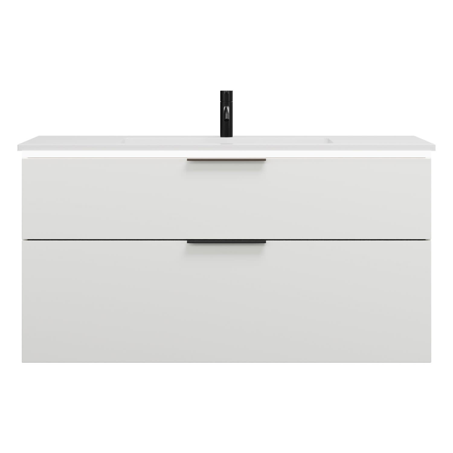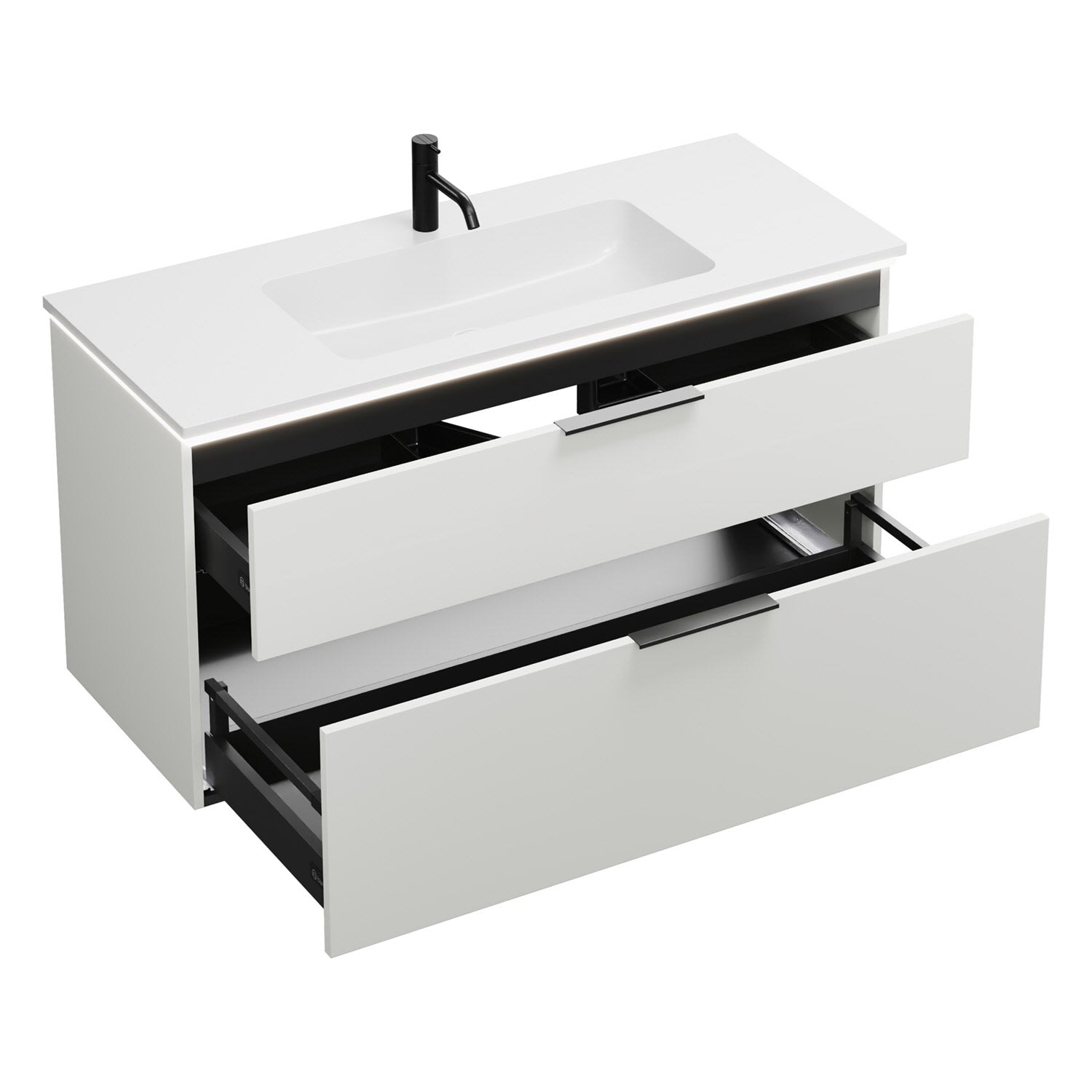 - 1 Schublade oben, 35 cm tief, mit Siphonausschnitt und Inneneinteilung