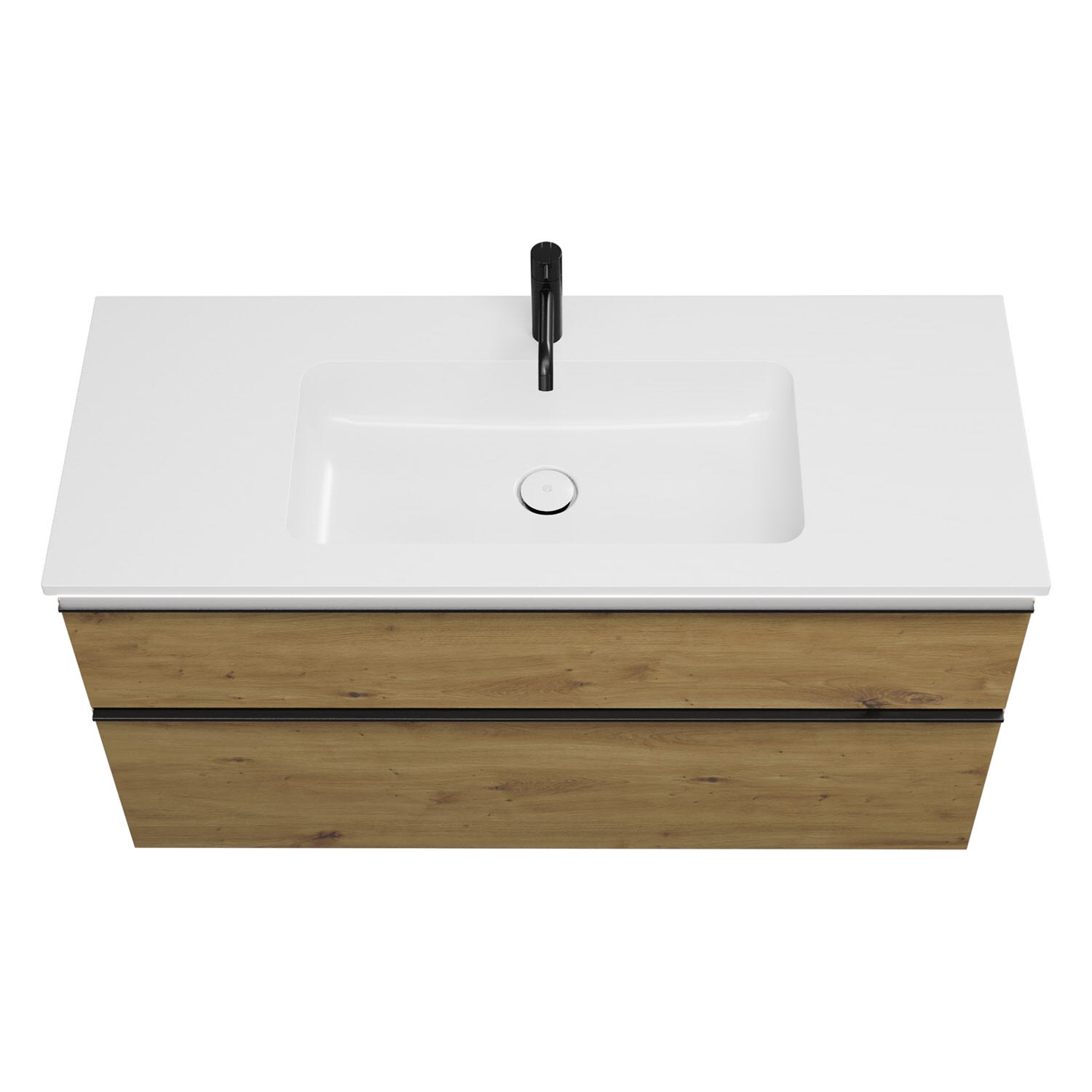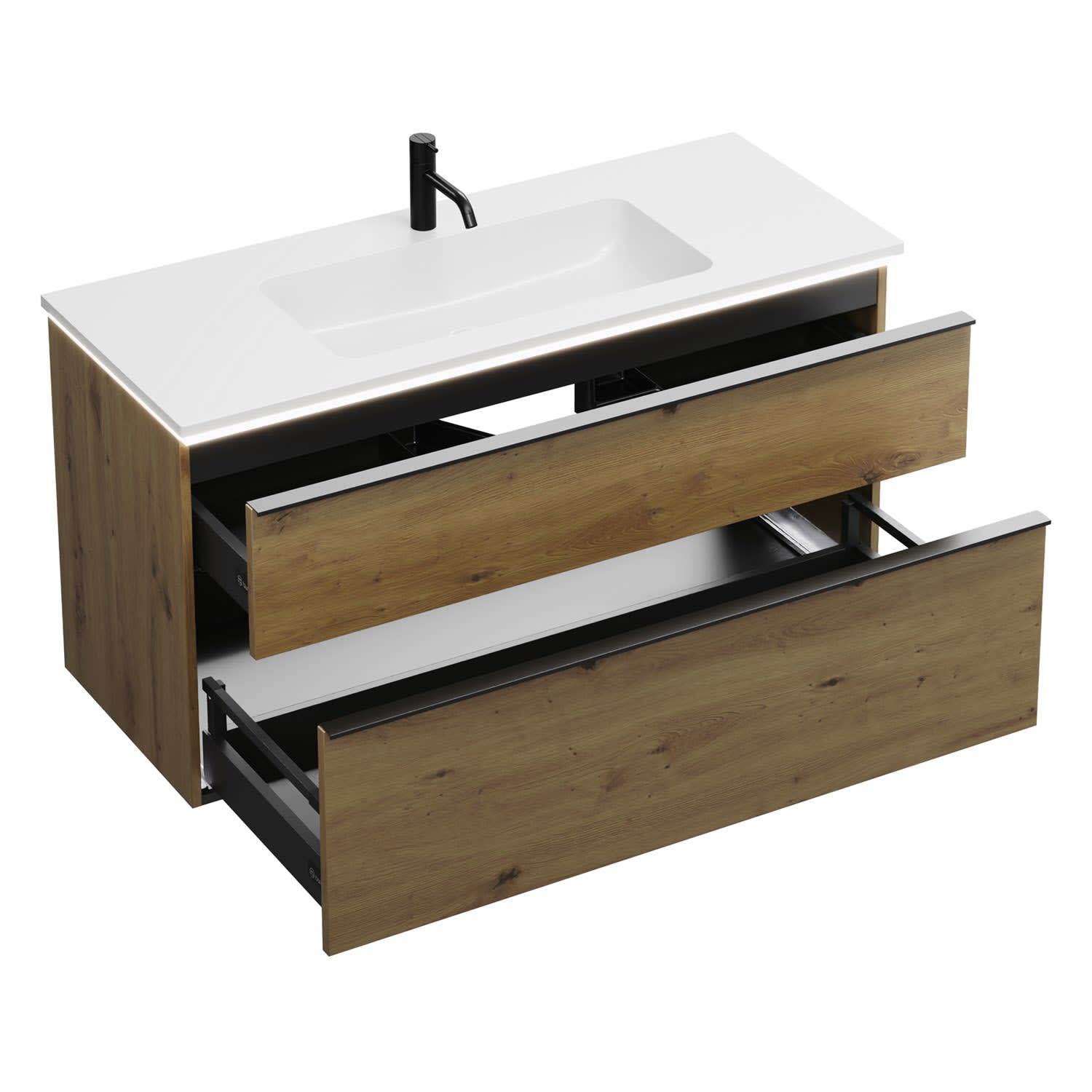 - 1 Schublade oben, 35 cm tief, mit Siphonausschnitt und Inneneinteilung