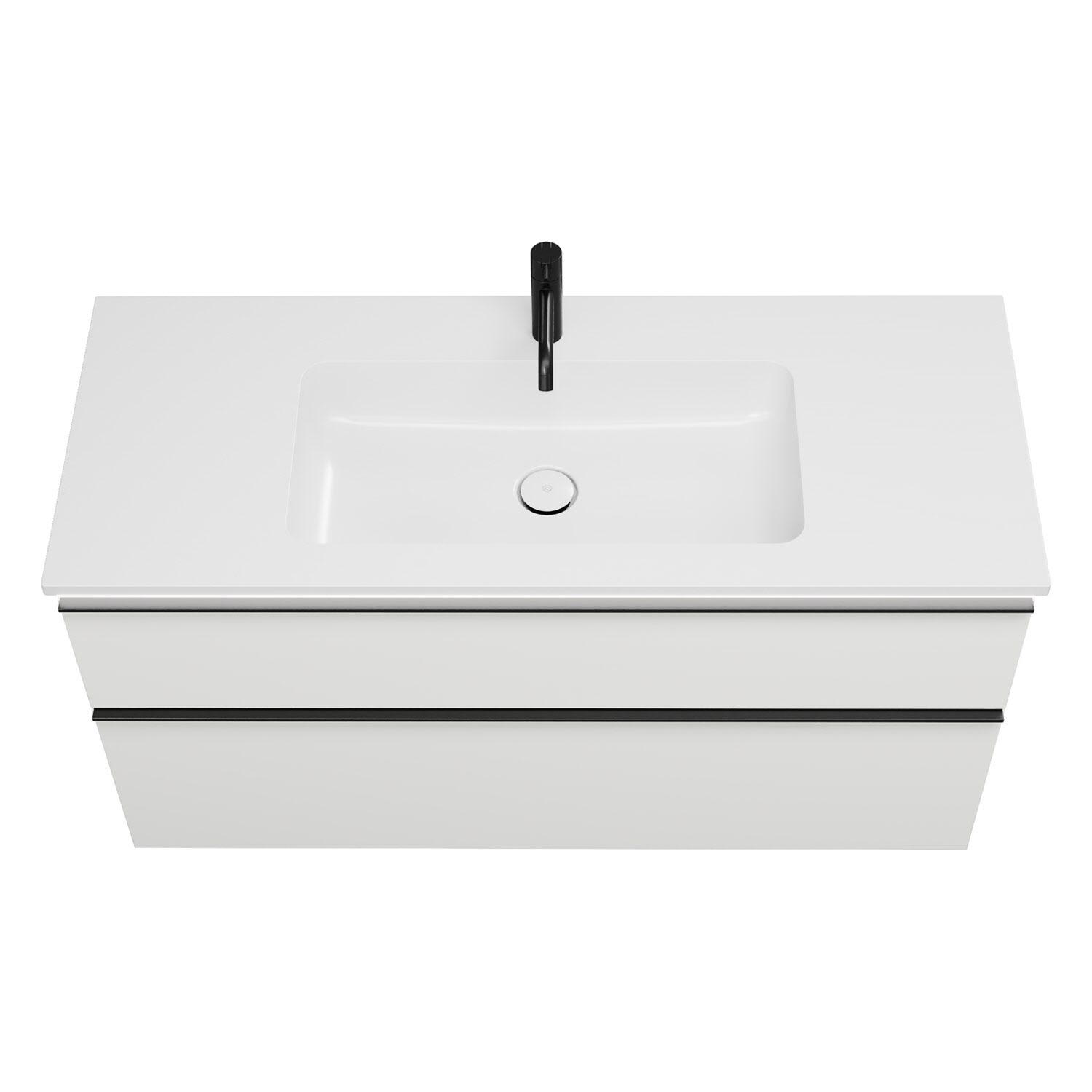 - 1 Schublade oben, 35 cm tief, mit Siphonausschnitt und Inneneinteilung
