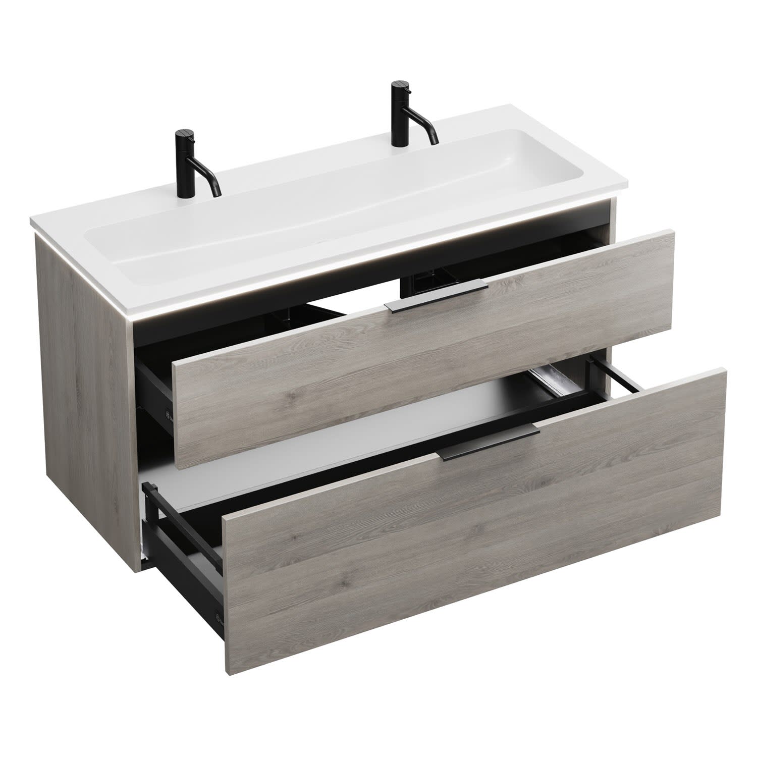- 1 Schublade oben, 35 cm tief, mit Siphonausschnitt und Inneneinteilung