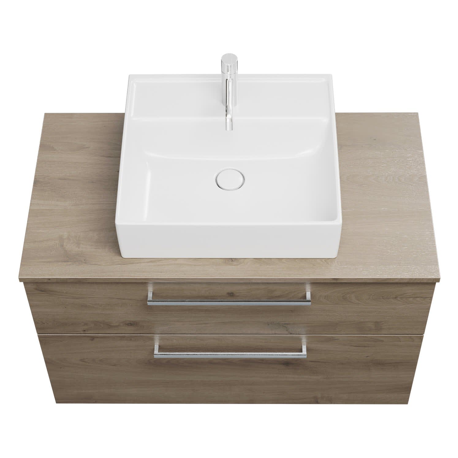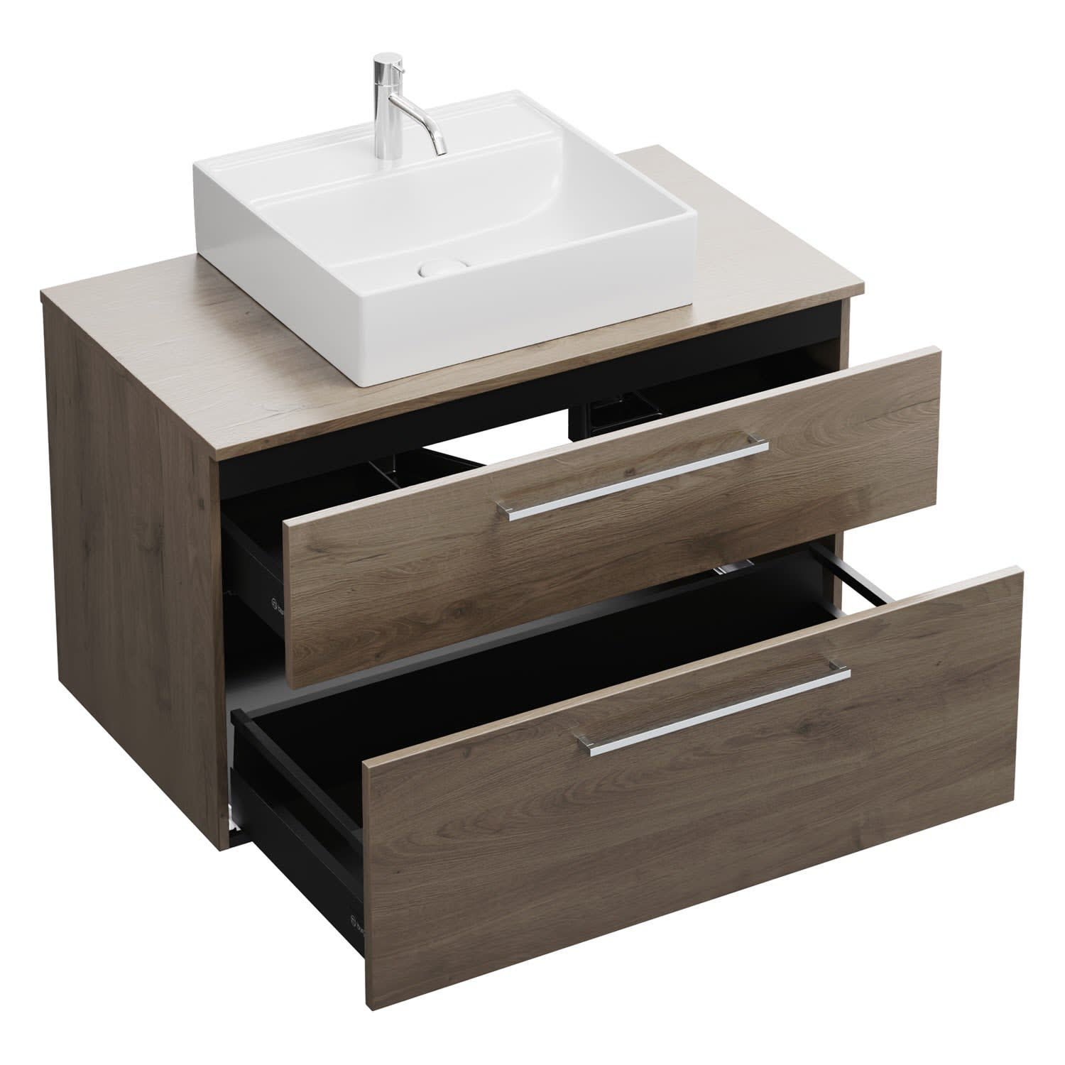 - 1 Schublade oben, 35 cm tief, mit Siphonausschnitt und Inneneinteilung