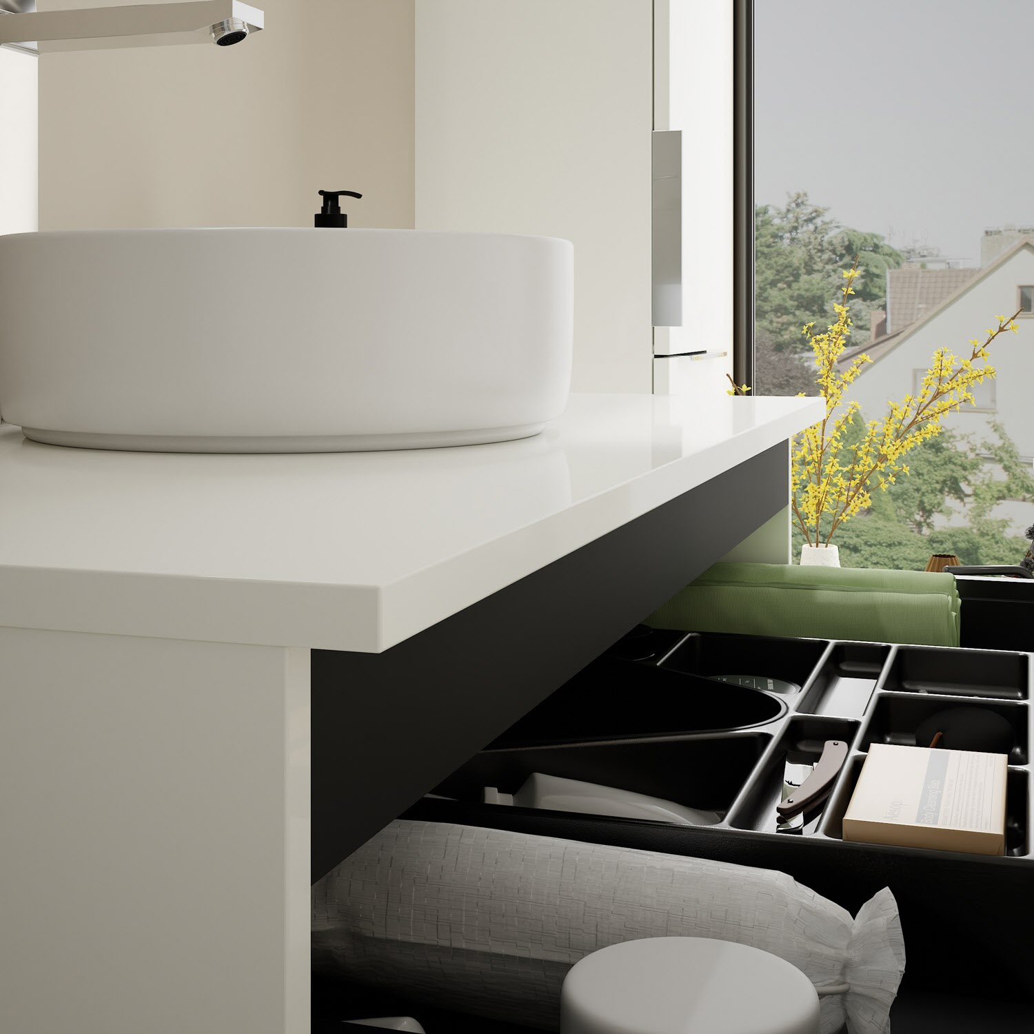 - 1 Schublade oben, 35 cm tief, mit Siphonausschnitt und Inneneinteilung