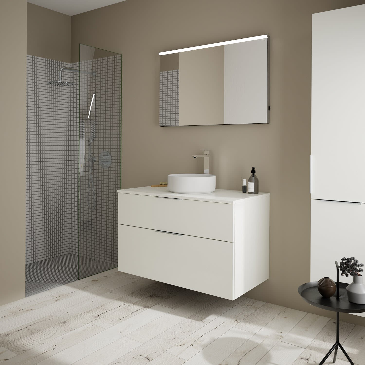 Aufsatzwaschtische müssen immer, mindestens 3 cm von den Außenkanten der Konsolenplatte entfernt sein.