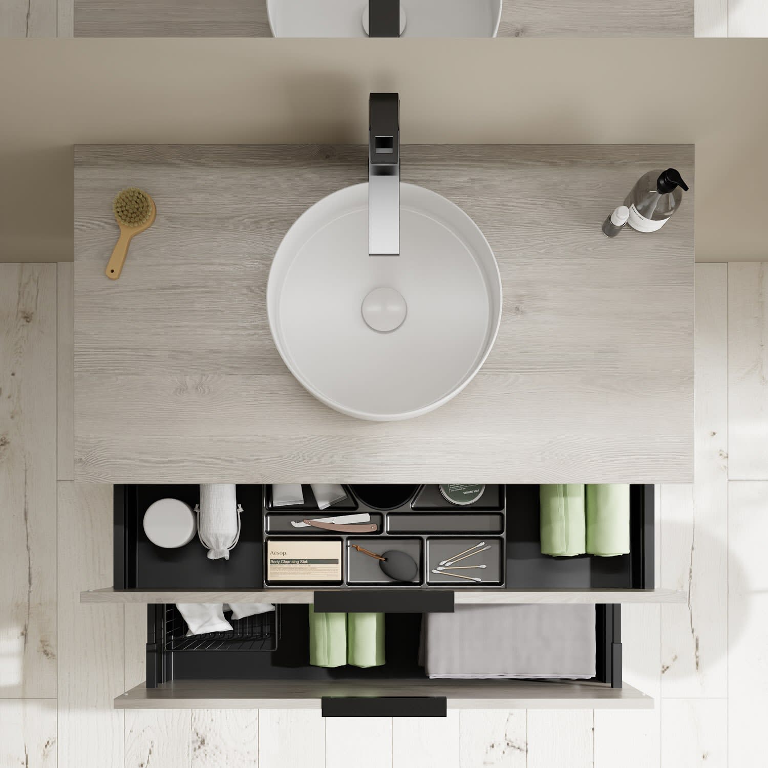 - 1 Schublade oben, 35 cm tief, mit Siphonausschnitt und Inneneinteilung