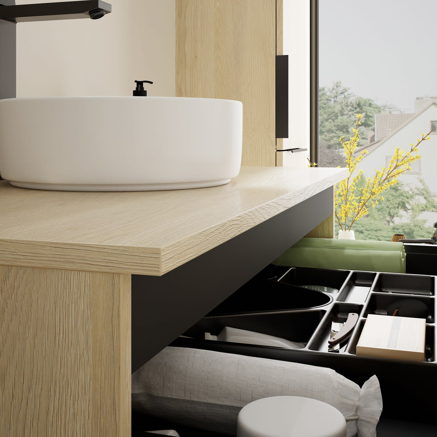 - 1 Schublade oben, 35 cm tief, mit Siphonausschnitt und Inneneinteilung