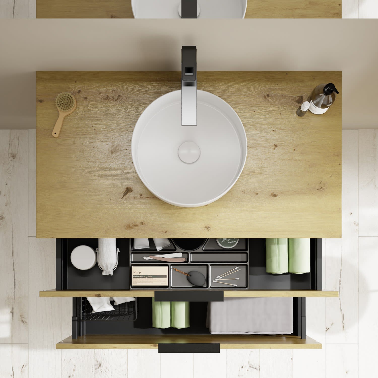 - 1 Schublade oben, 35 cm tief, mit Siphonausschnitt und Inneneinteilung
