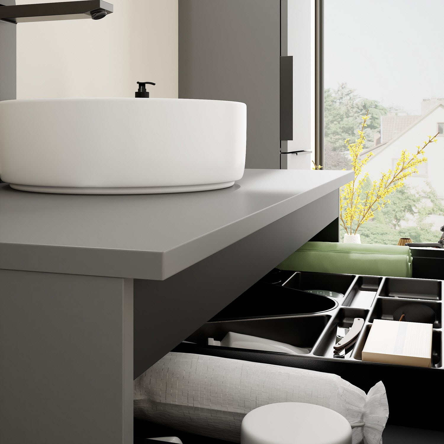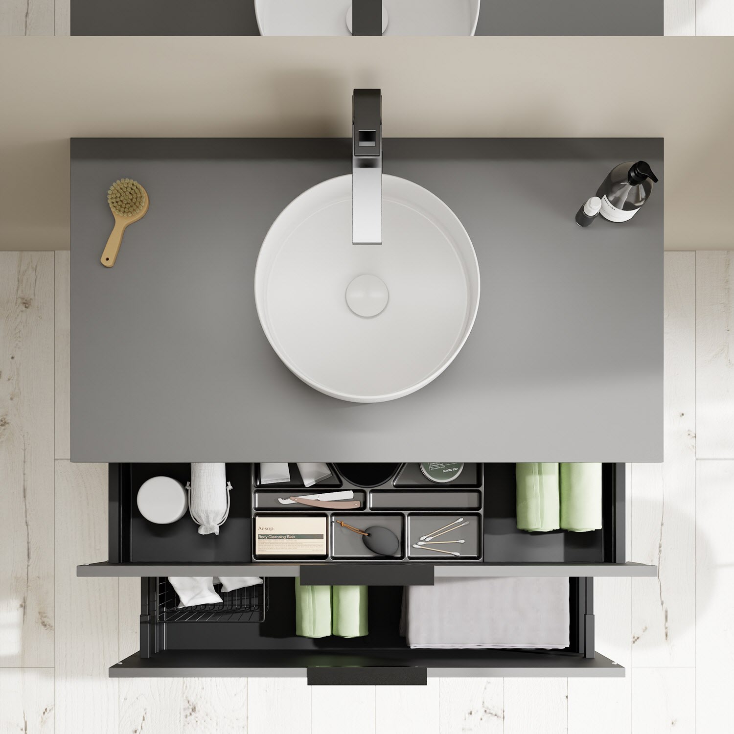 - 1 Schublade oben, 35 cm tief, mit Siphonausschnitt und Inneneinteilung