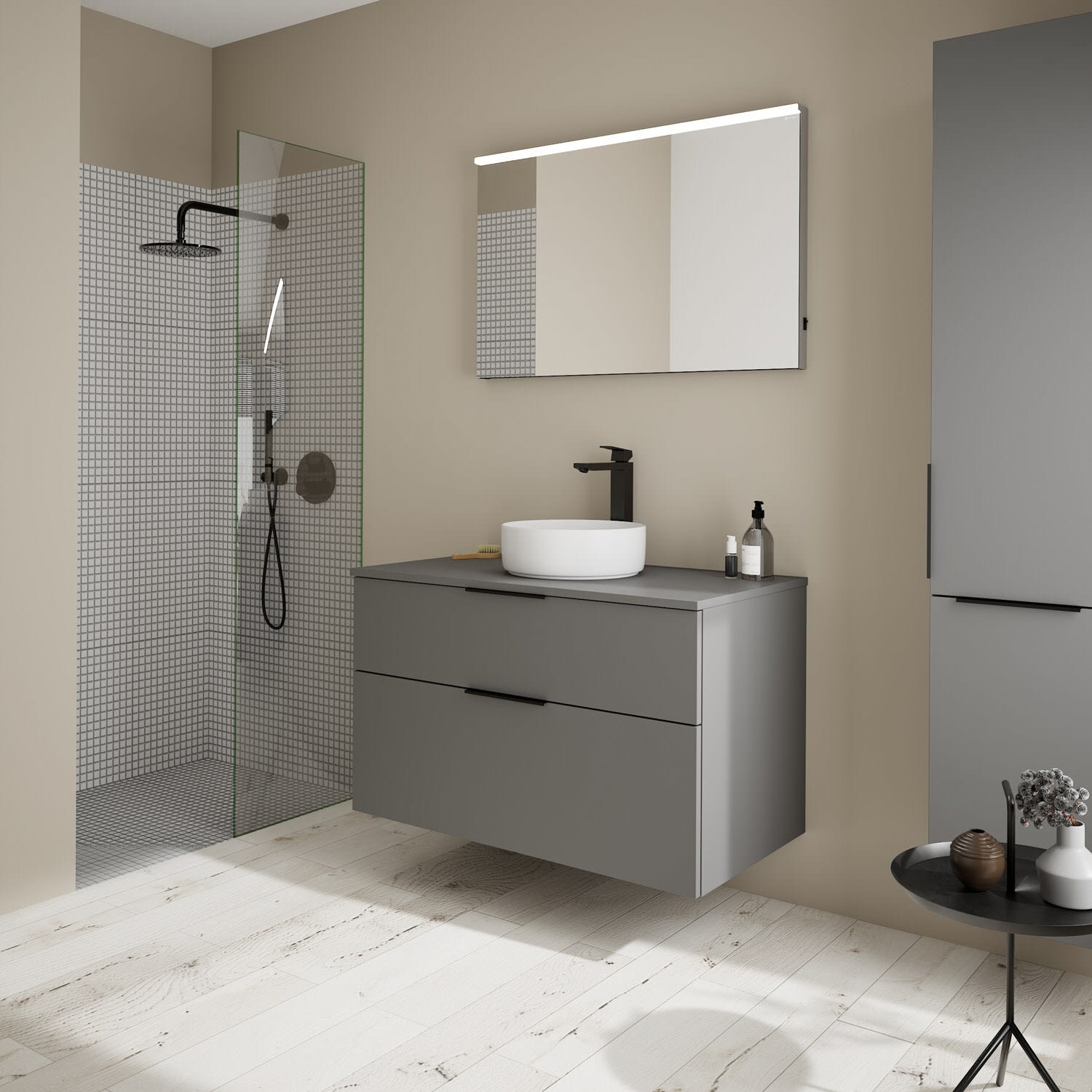 - Boden/Rückwand: Anthrazitgrau