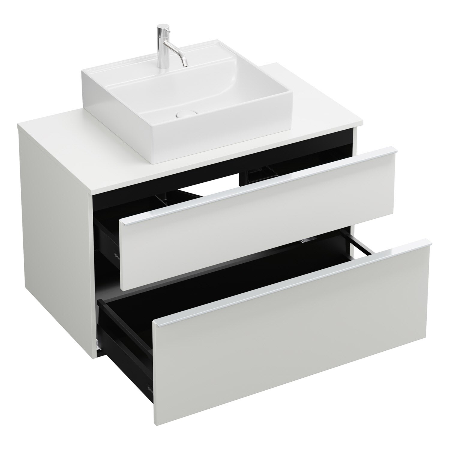 - 1 Schublade oben, 35 cm tief, mit Siphonausschnitt und Inneneinteilung