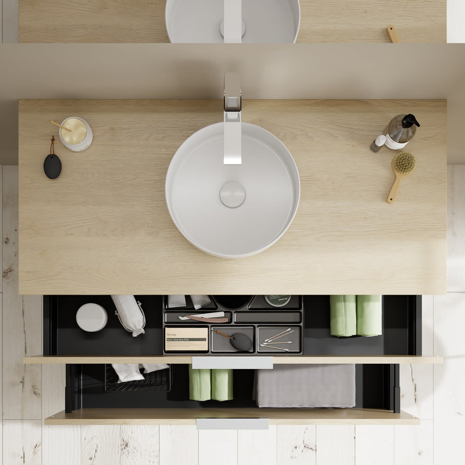 - 1 Schublade oben, 35 cm tief, mit Siphonausschnitt und Inneneinteilung