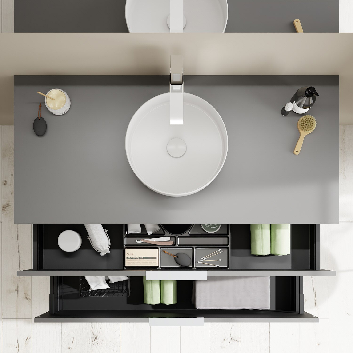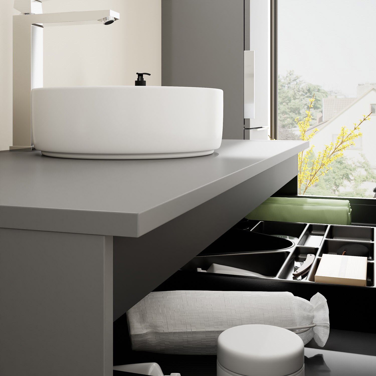 - 1 Schublade oben, 35 cm tief, mit Siphonausschnitt und Inneneinteilung