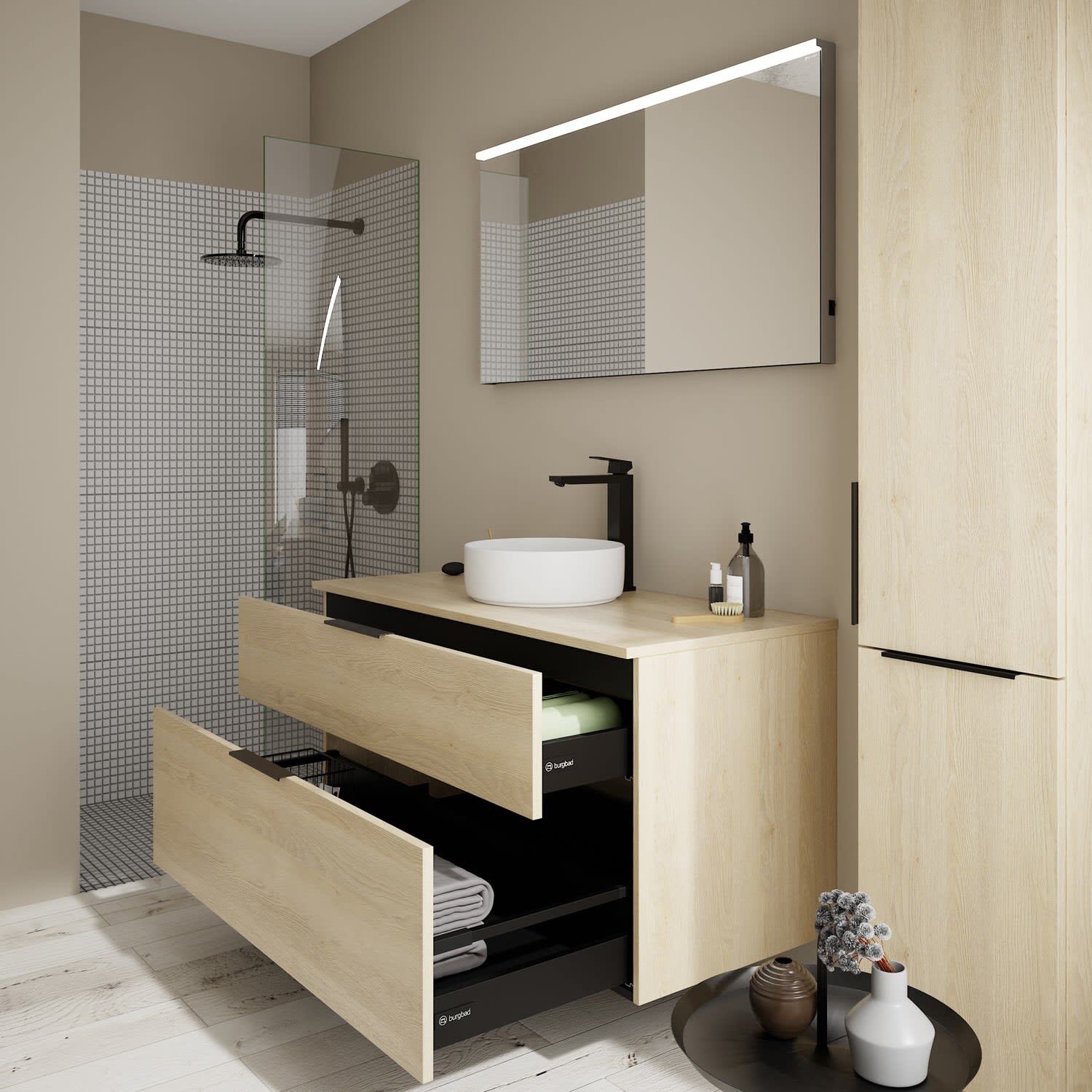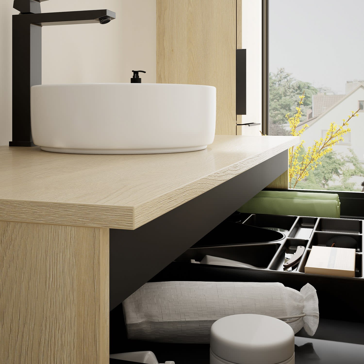 - 1 Schublade oben, 35 cm tief, mit Siphonausschnitt und Inneneinteilung