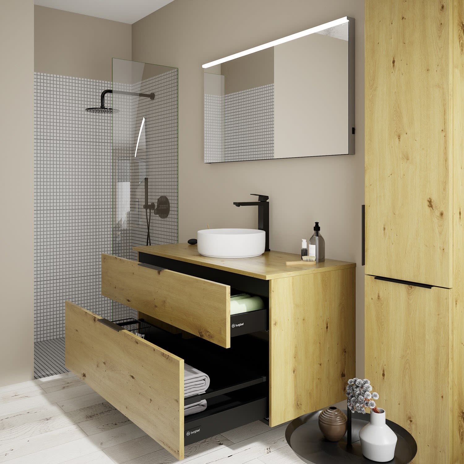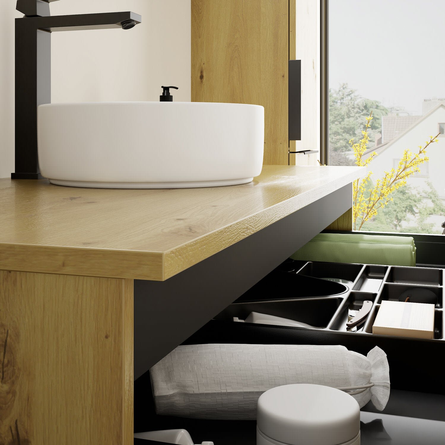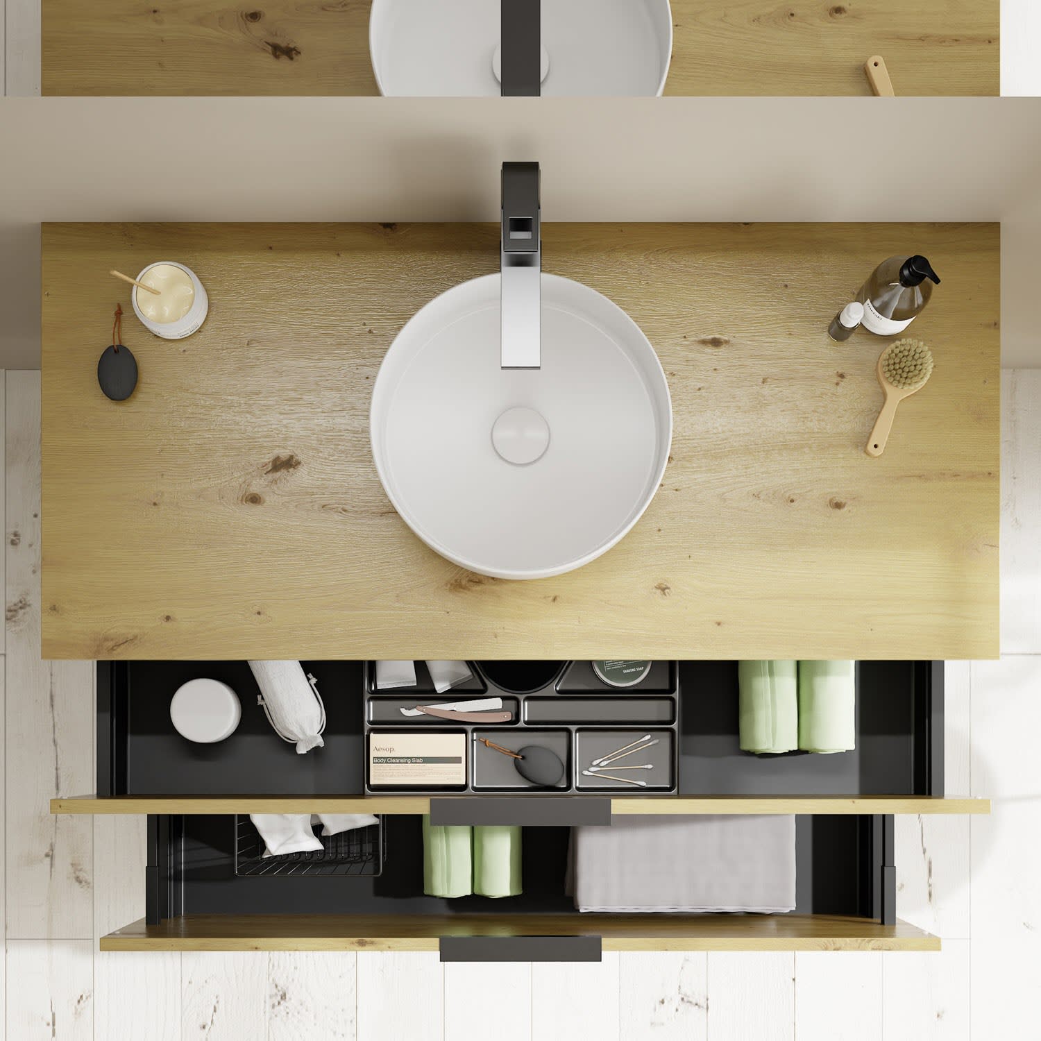 - 1 Schublade oben, 35 cm tief, mit Siphonausschnitt und Inneneinteilung