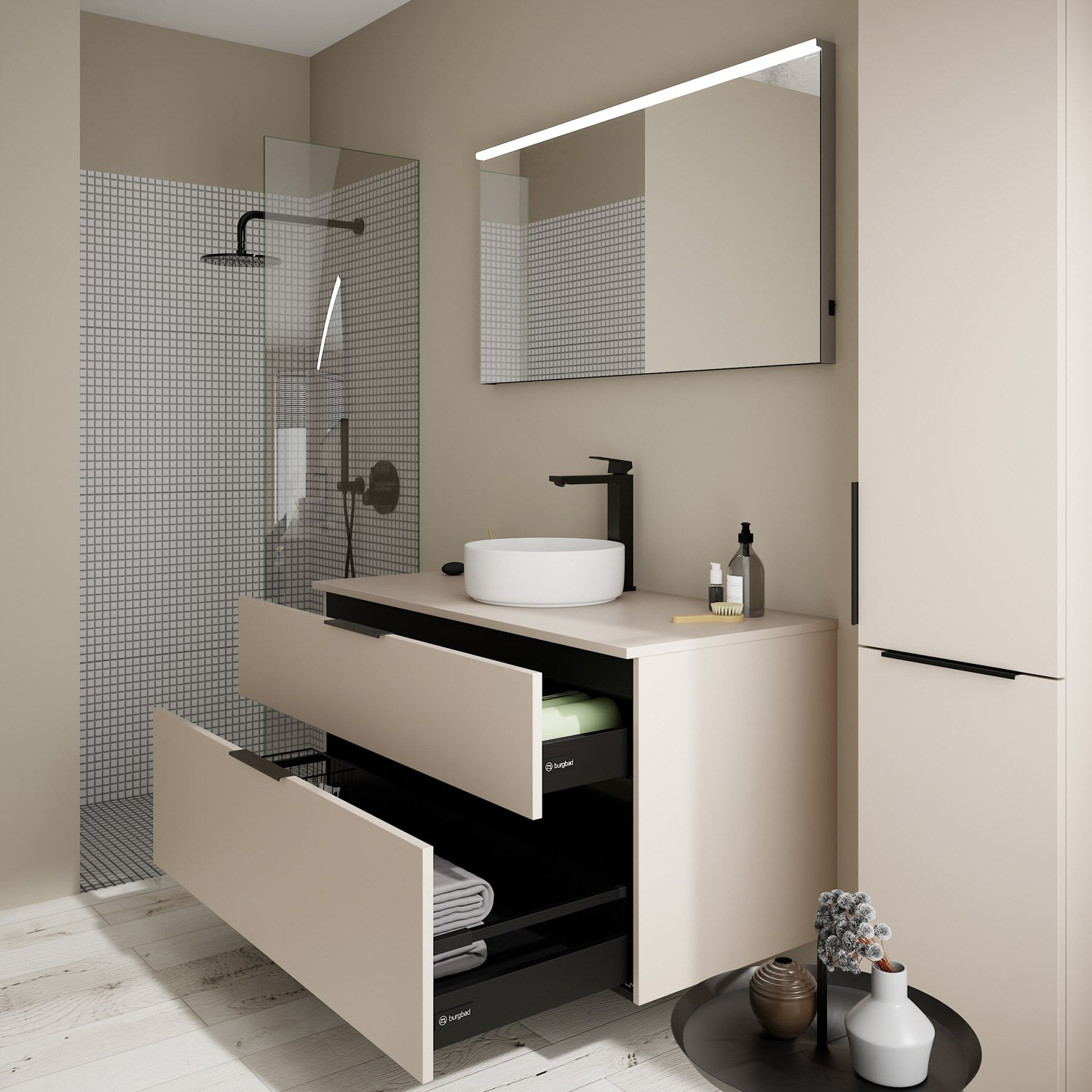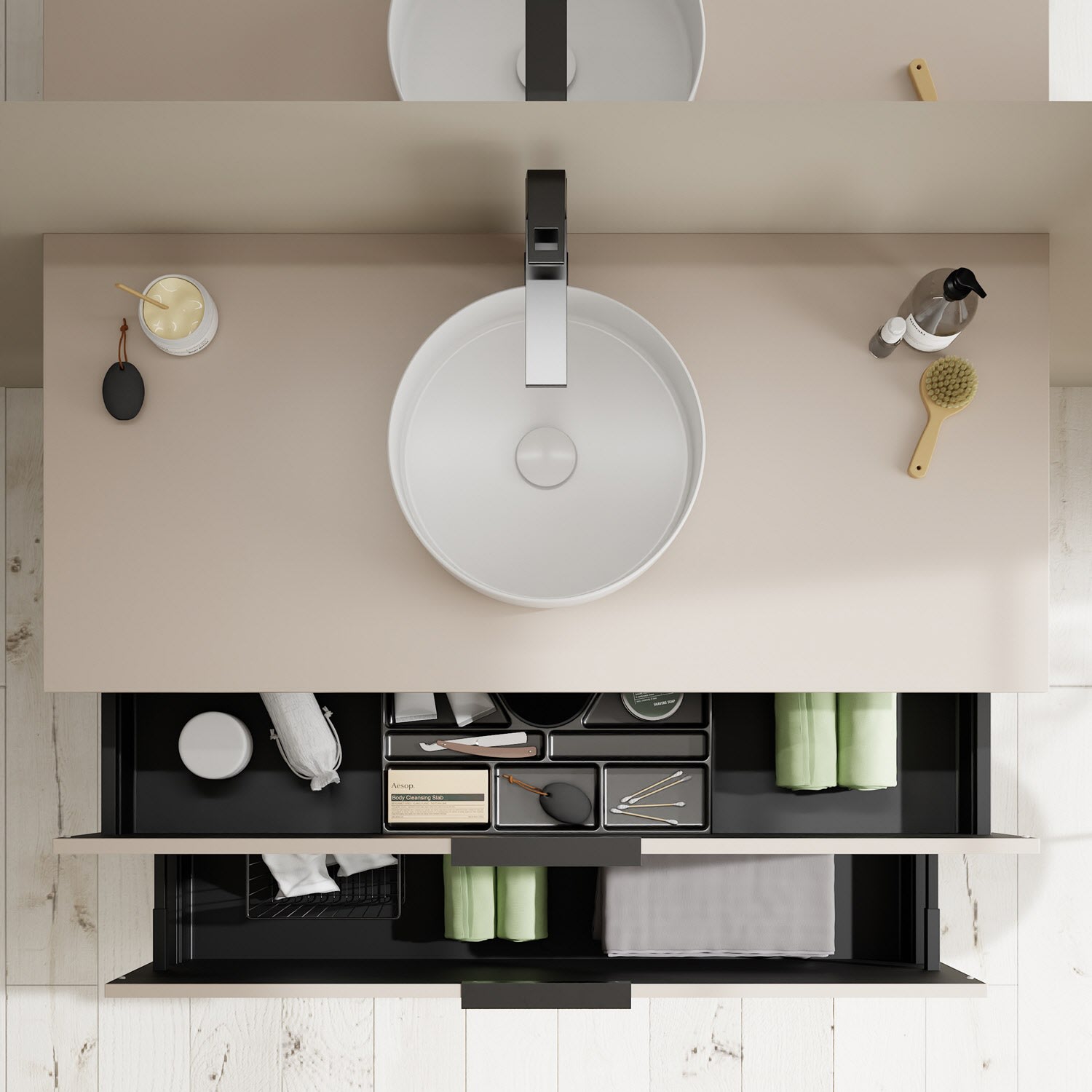 - 1 Schublade oben, 35 cm tief, mit Siphonausschnitt und Inneneinteilung
