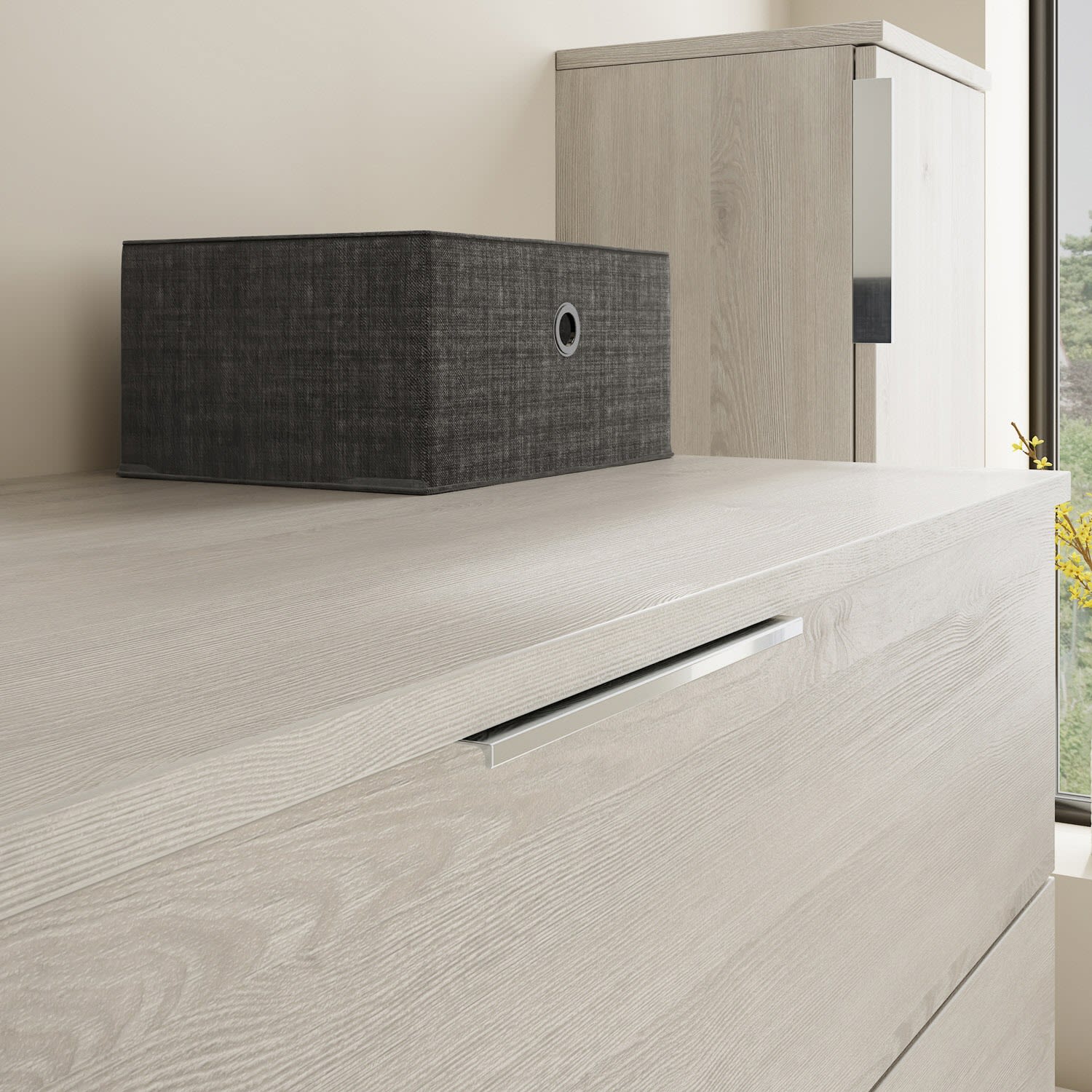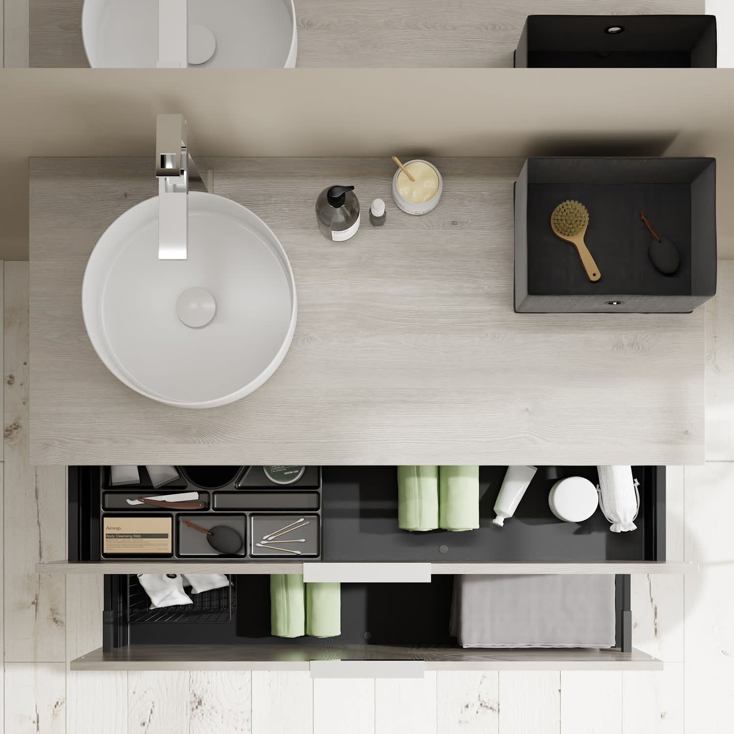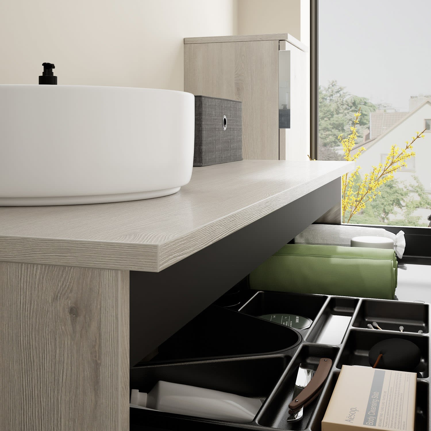 - 1 Schublade oben, 35 cm tief, mit Siphonausschnitt und Inneneinteilung