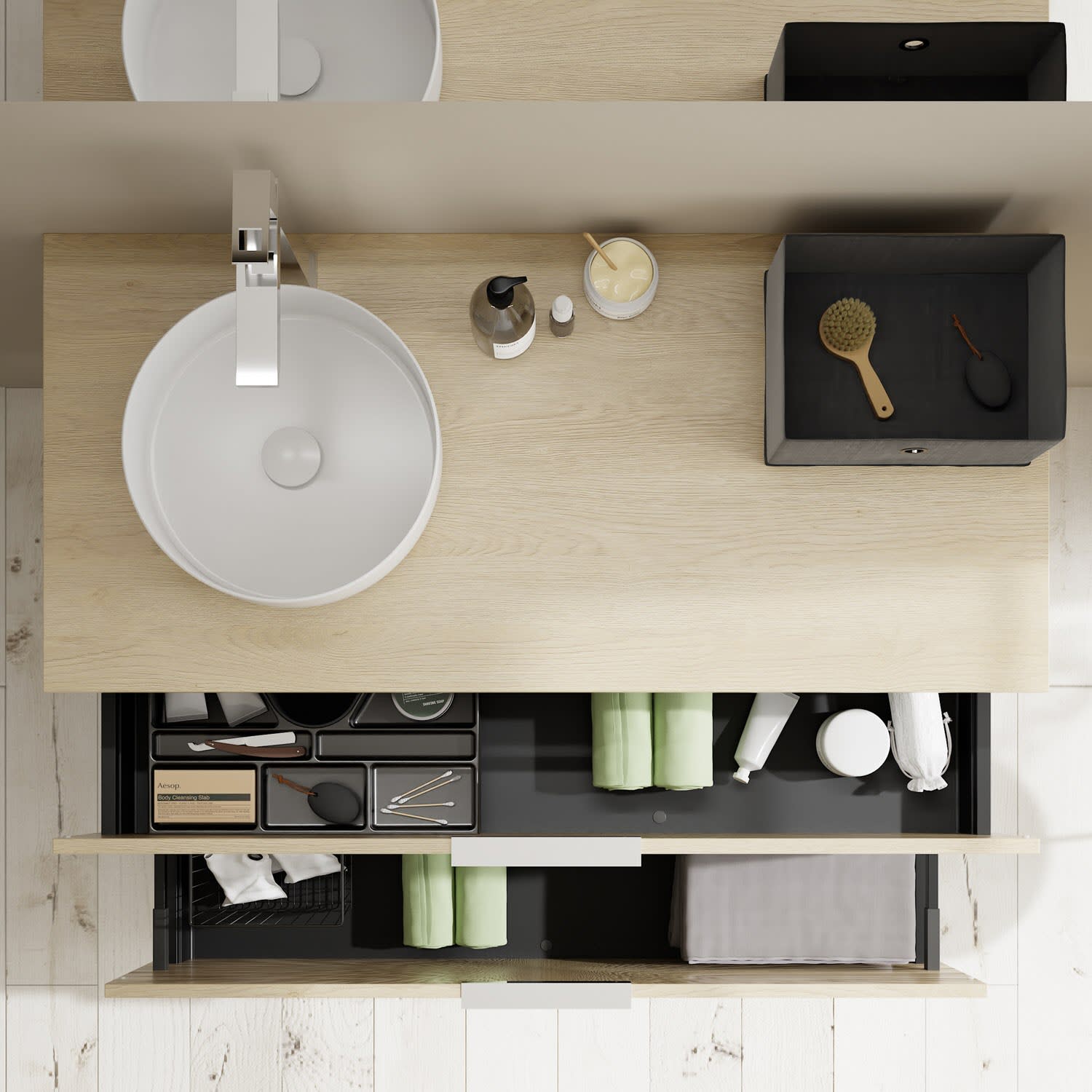 - 1 Schublade oben, 35 cm tief, mit Siphonausschnitt und Inneneinteilung