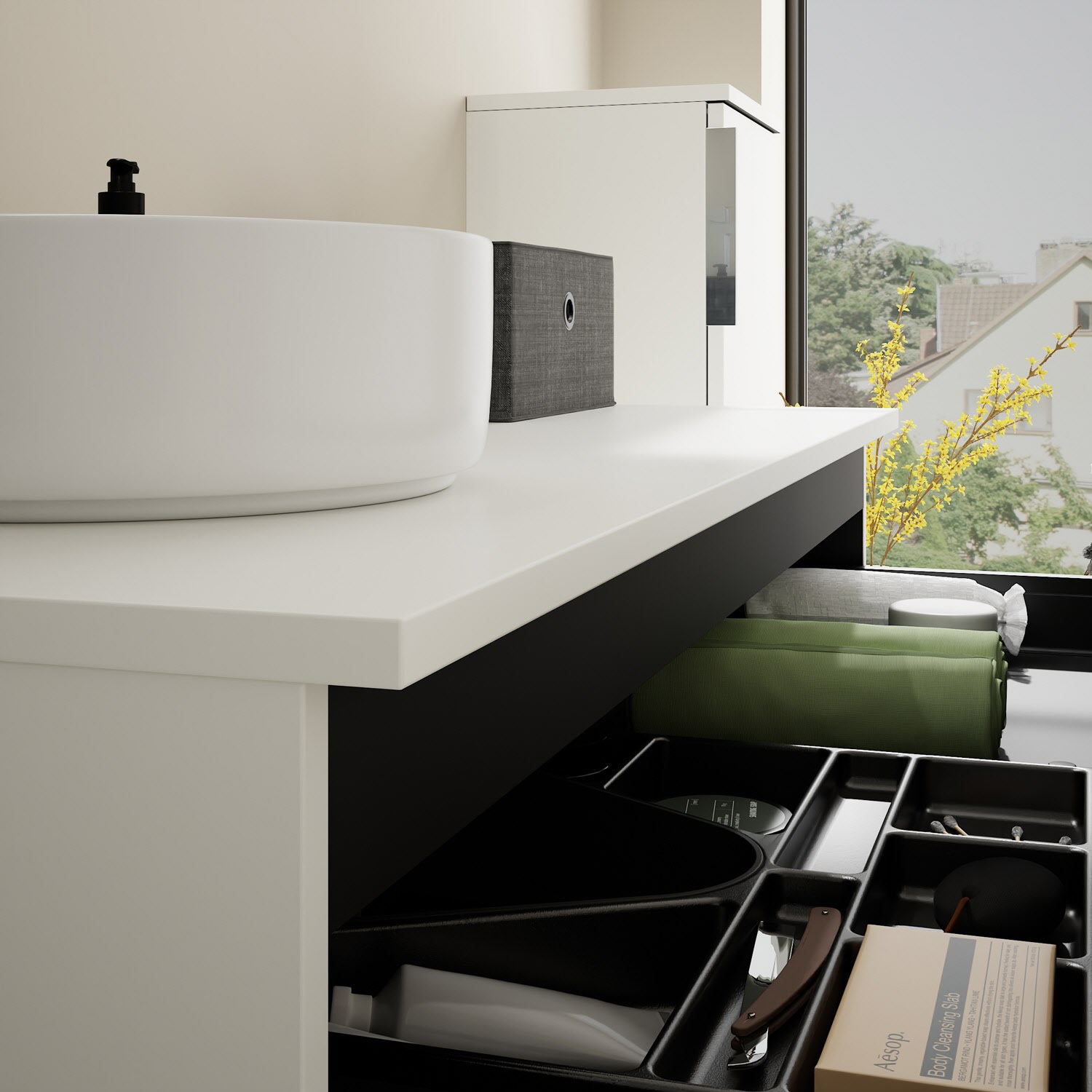 - 1 Schublade oben, 35 cm tief, mit Siphonausschnitt und Inneneinteilung