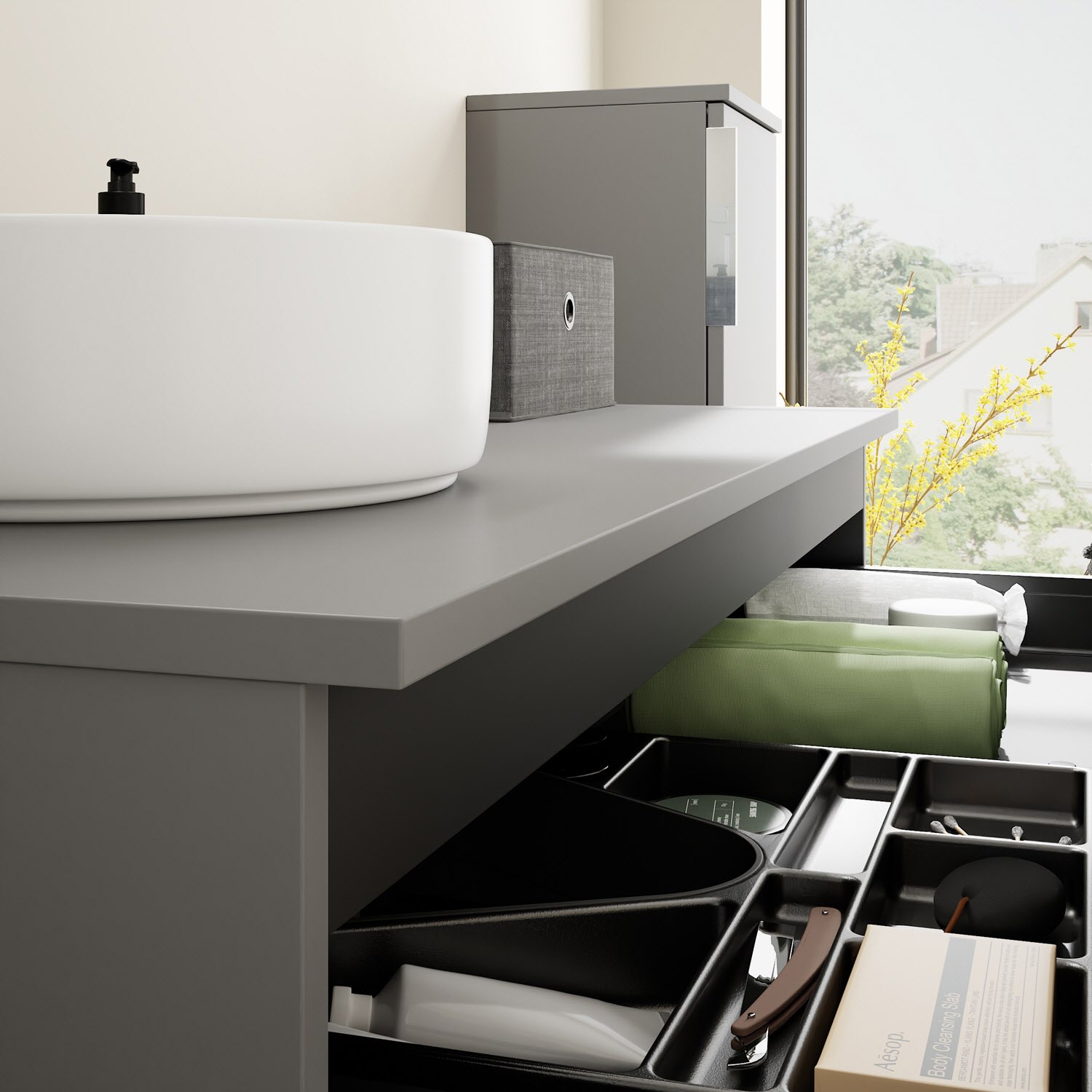 - 1 Schublade oben, 35 cm tief, mit Siphonausschnitt und Inneneinteilung