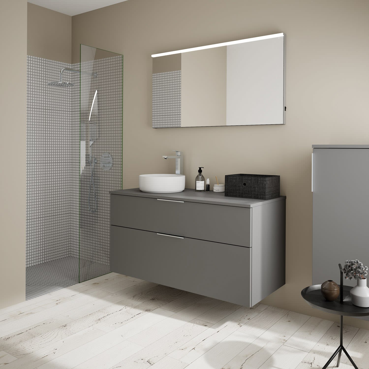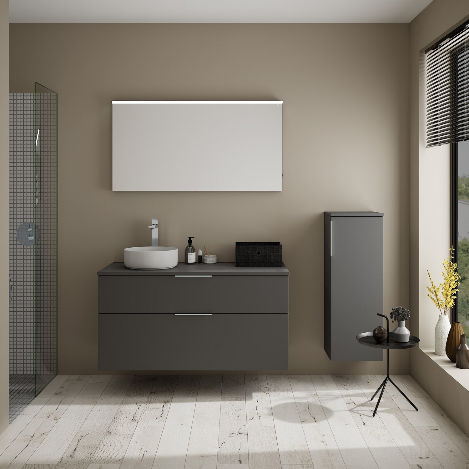 - Boden/Rückwand: Anthrazitgrau