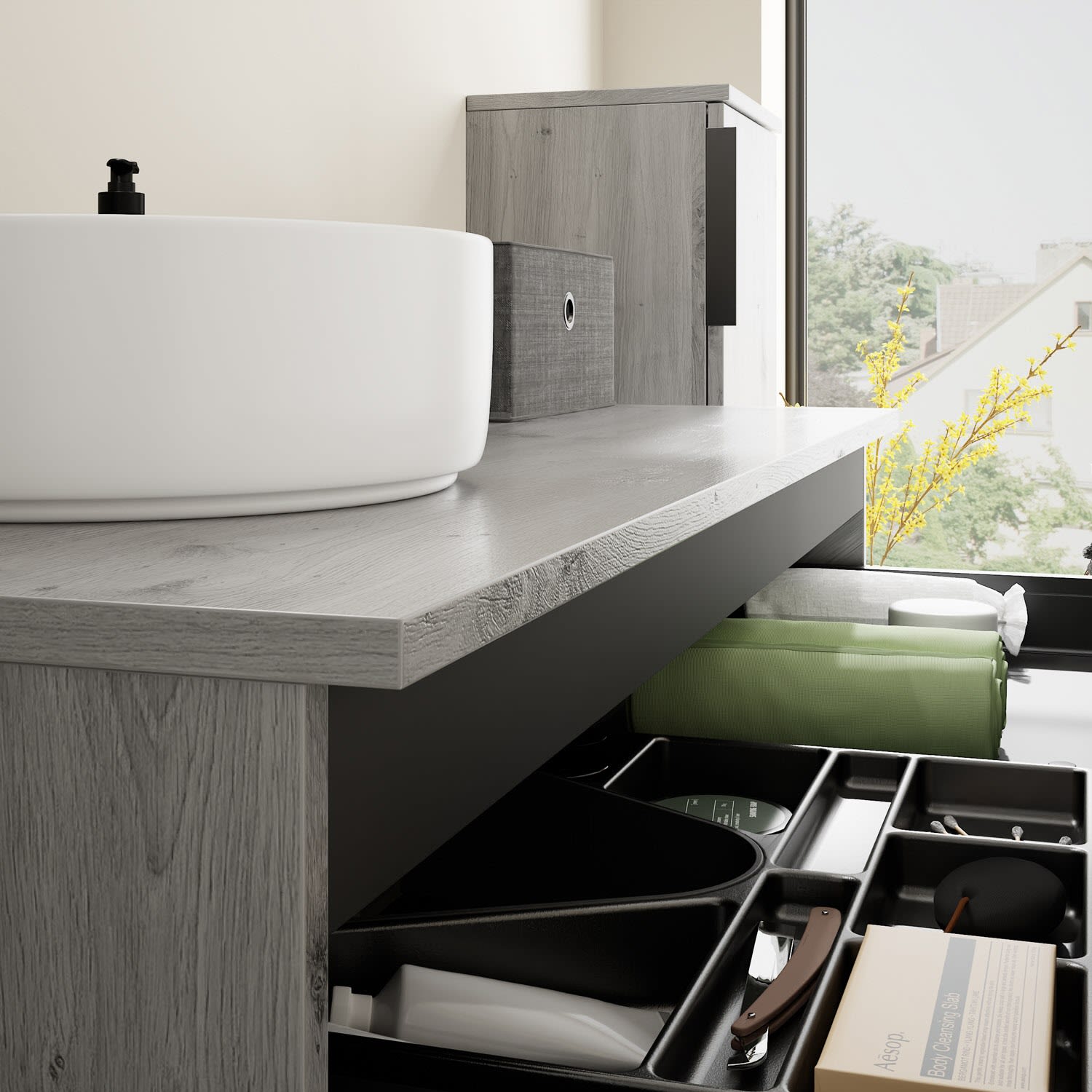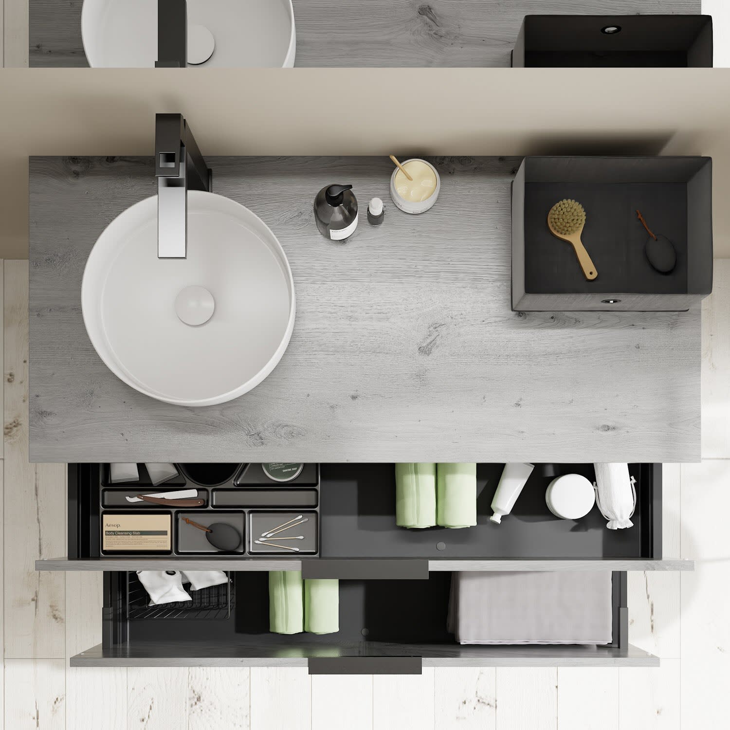 - 1 Schublade oben, 35 cm tief, mit Siphonausschnitt und Inneneinteilung