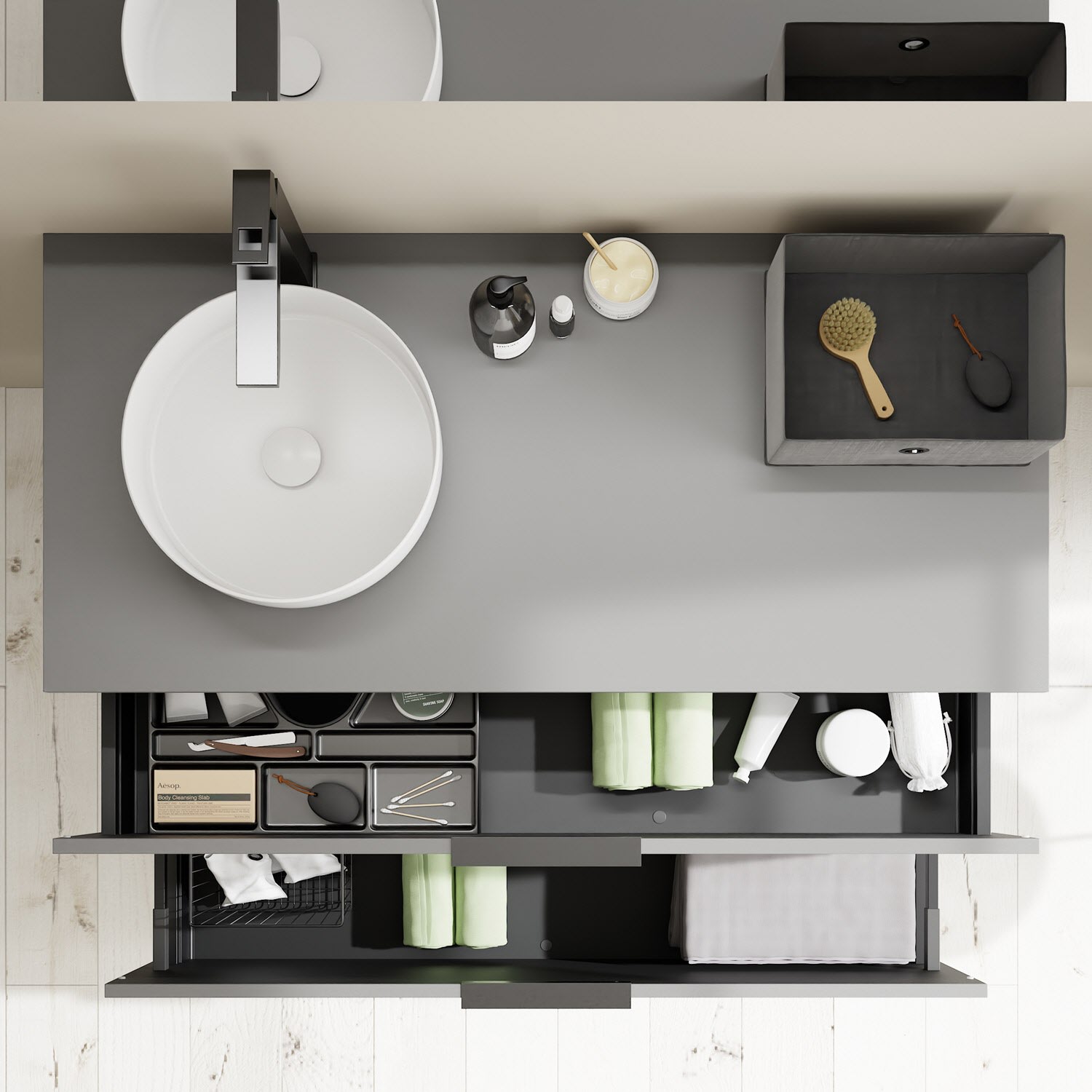 - 1 Schublade oben, 35 cm tief, mit Siphonausschnitt und Inneneinteilung