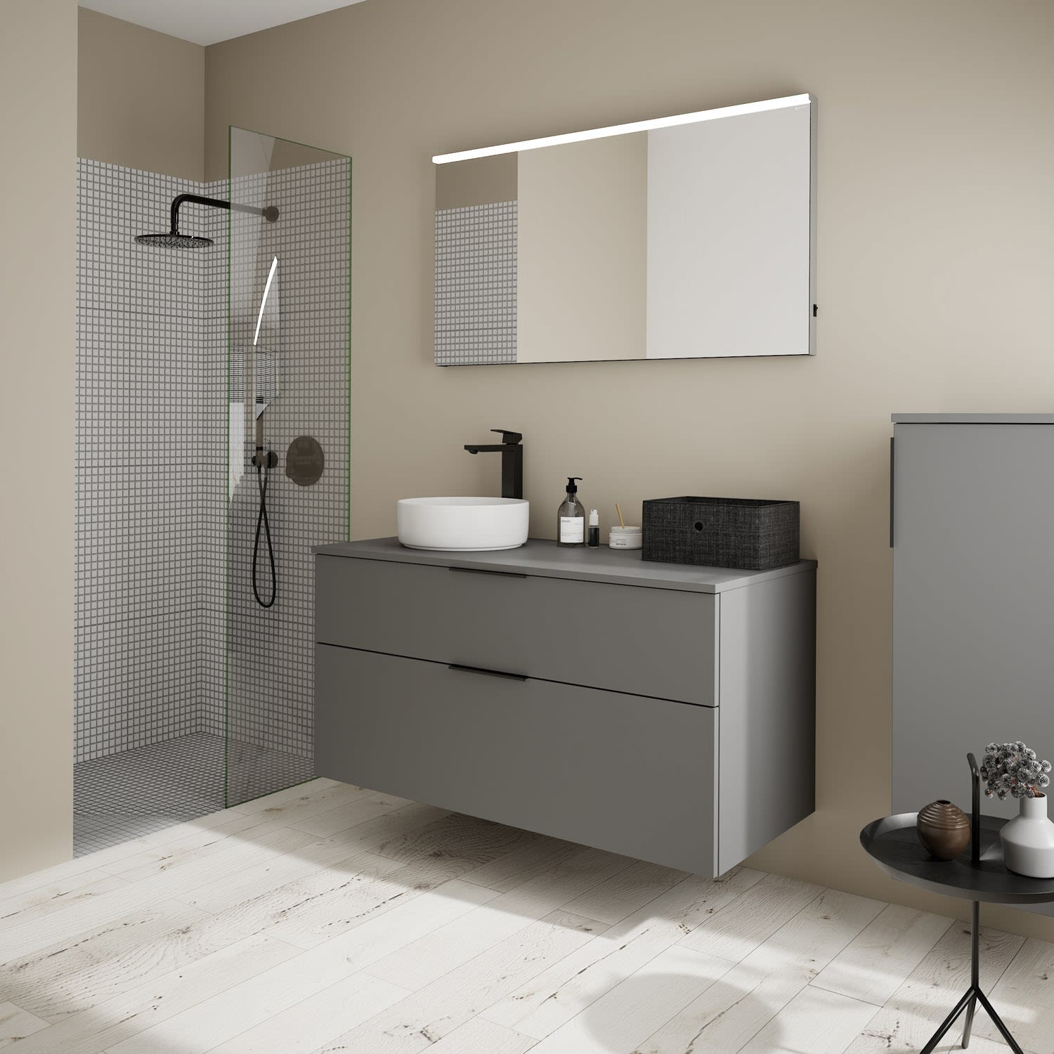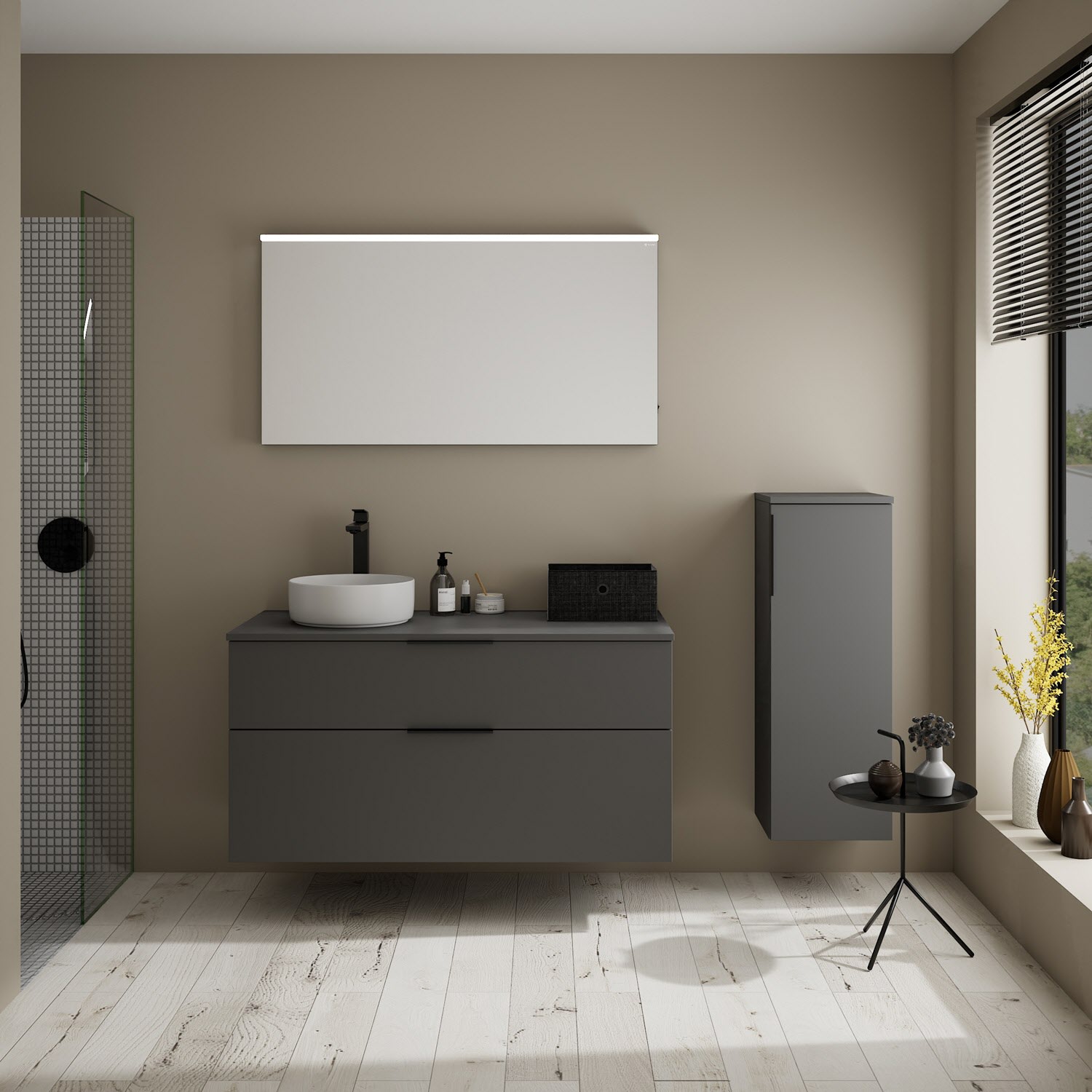 - Boden/Rückwand: Anthrazitgrau
