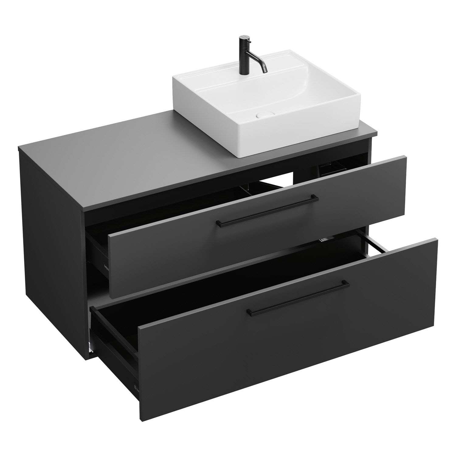 - 1 Schublade oben, 35 cm tief, mit Siphonausschnitt und Inneneinteilung