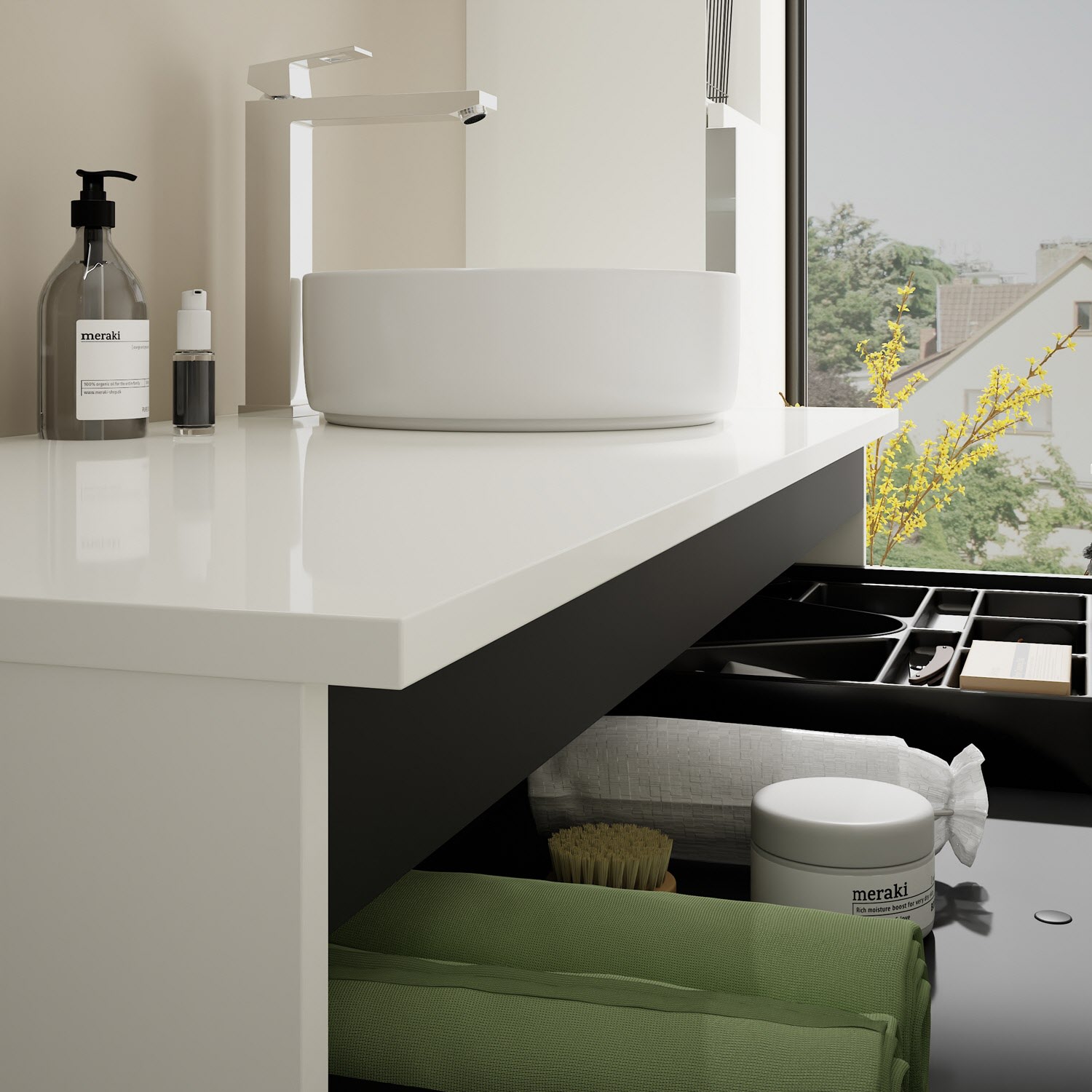 - 1 Schublade oben, 35 cm tief, mit Siphonausschnitt und Inneneinteilung