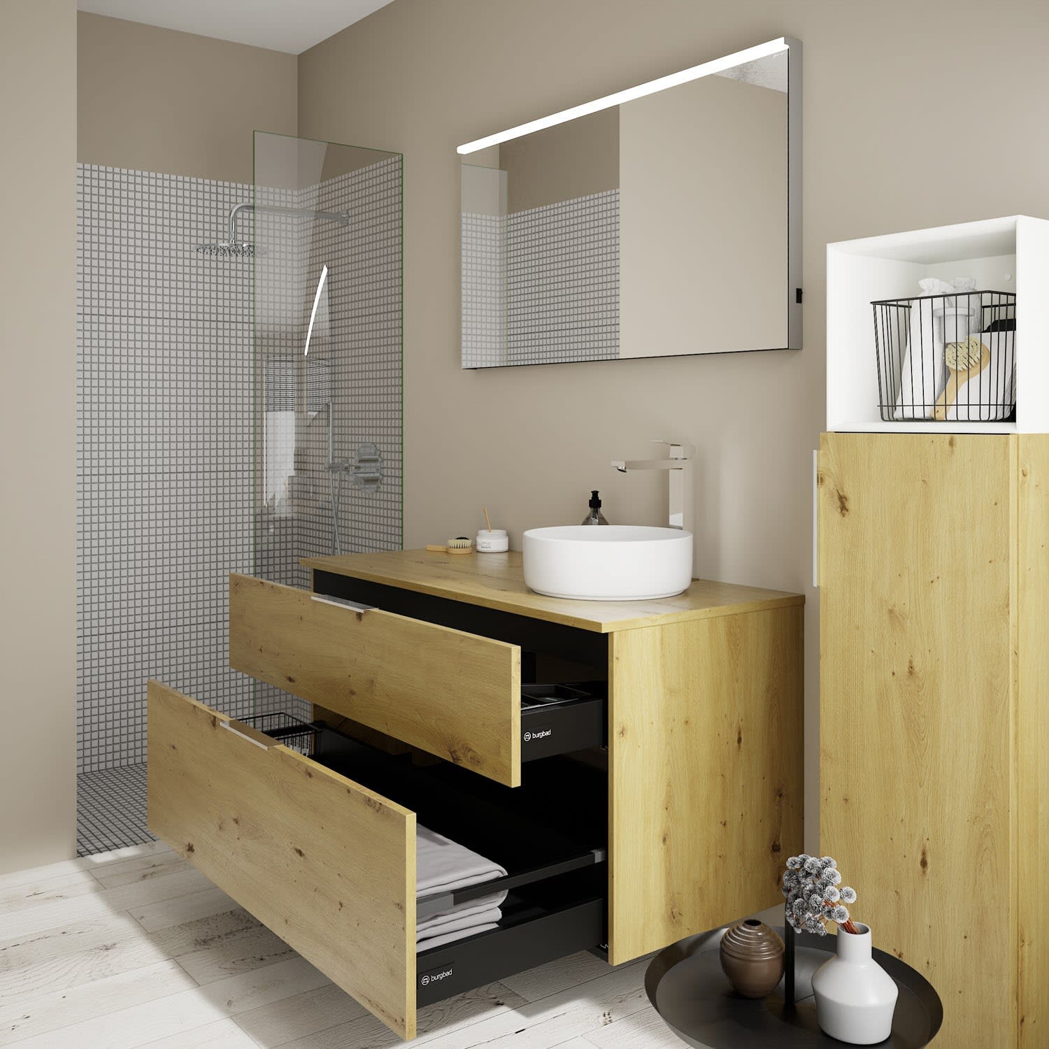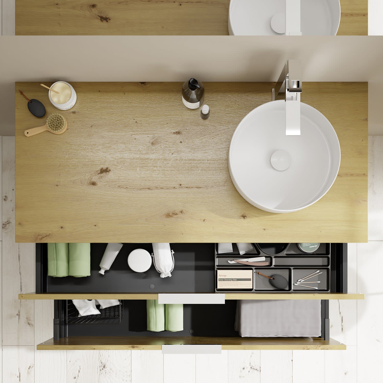 - 1 Schublade oben, 35 cm tief, mit Siphonausschnitt und Inneneinteilung