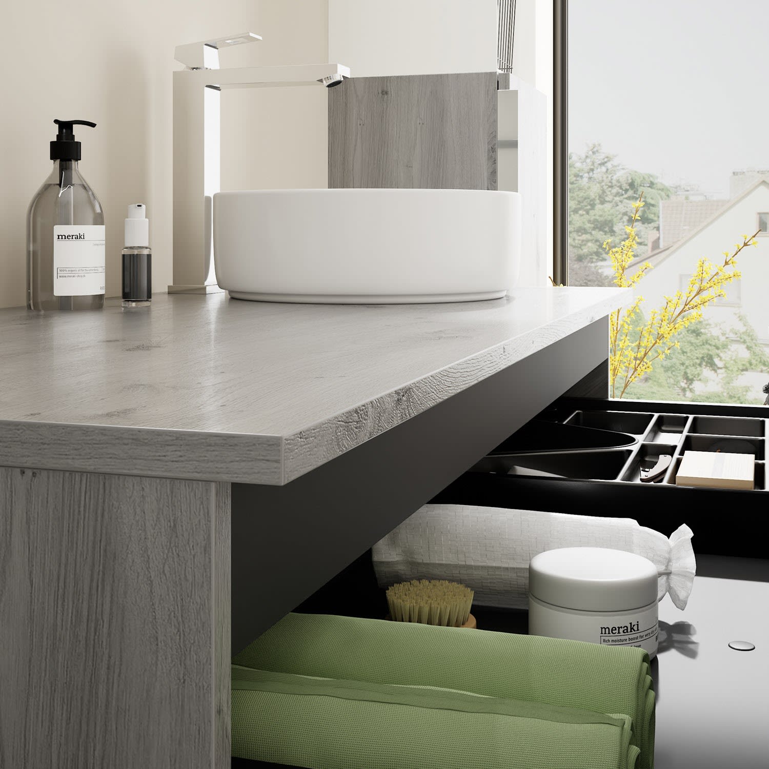 - 1 Schublade oben, 35 cm tief, mit Siphonausschnitt und Inneneinteilung