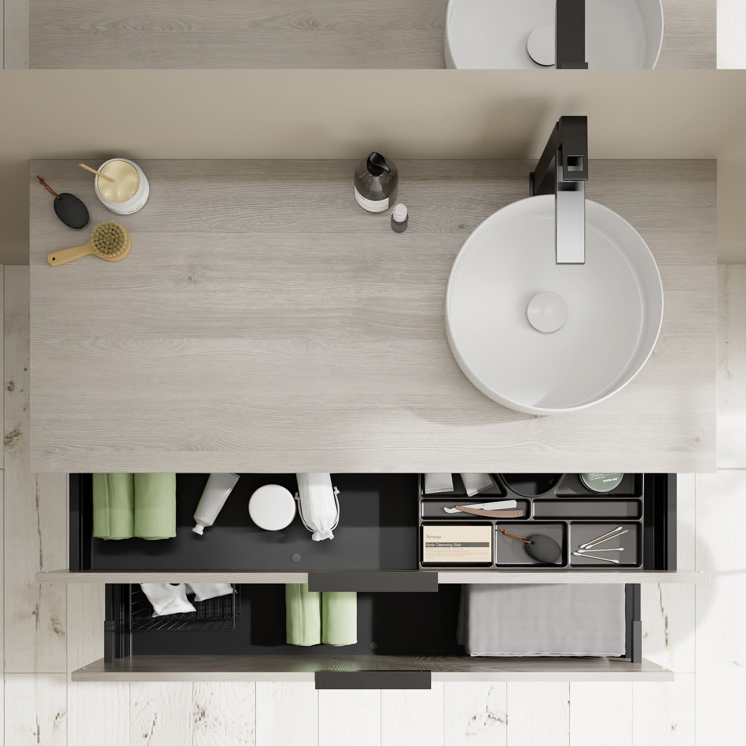 - 1 Schublade oben, 35 cm tief, mit Siphonausschnitt und Inneneinteilung