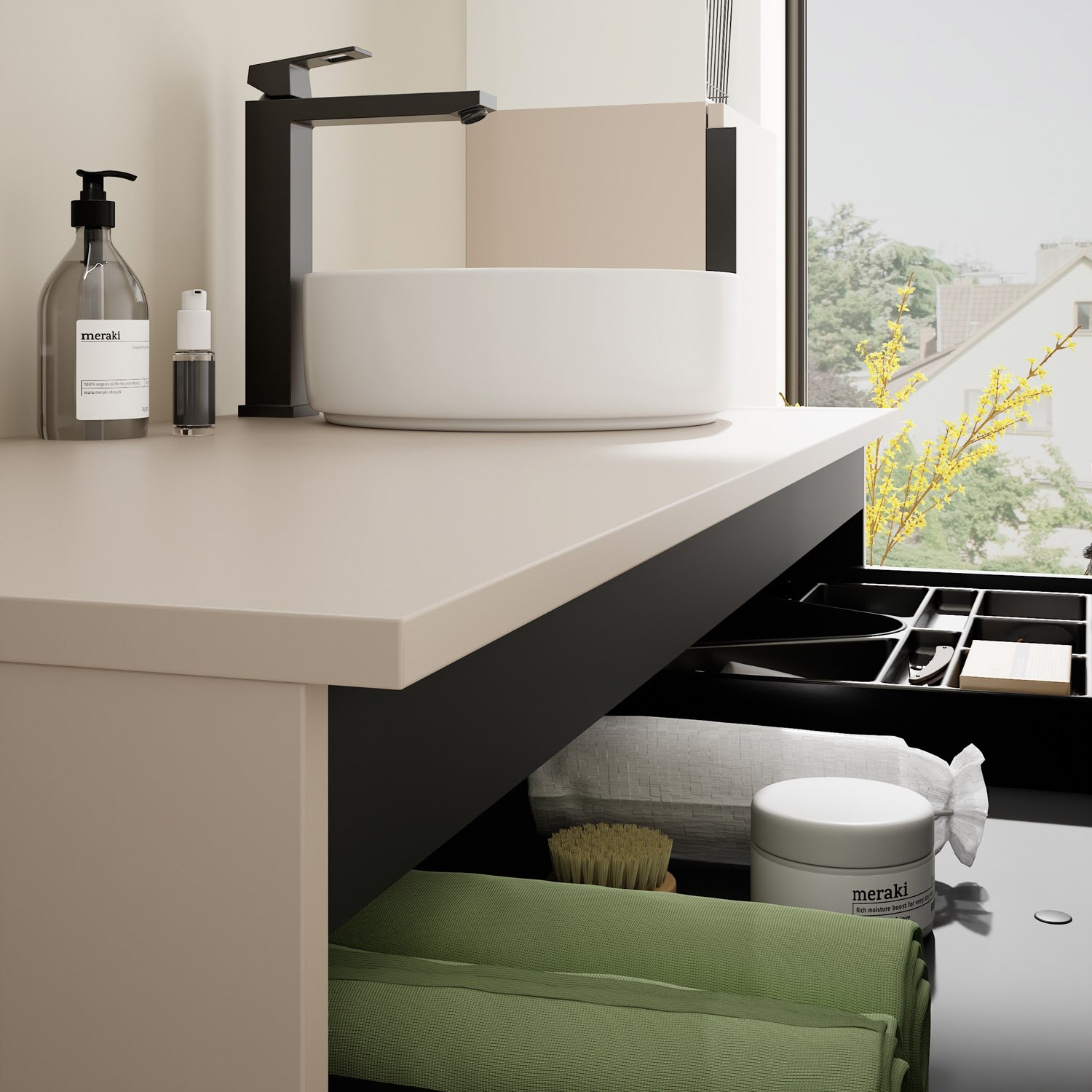 - 1 Schublade oben, 35 cm tief, mit Siphonausschnitt und Inneneinteilung