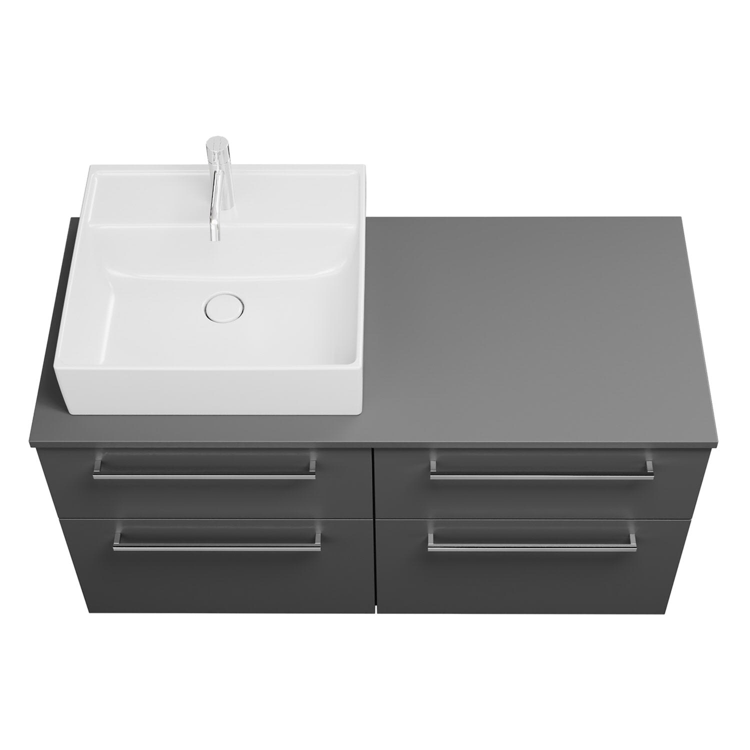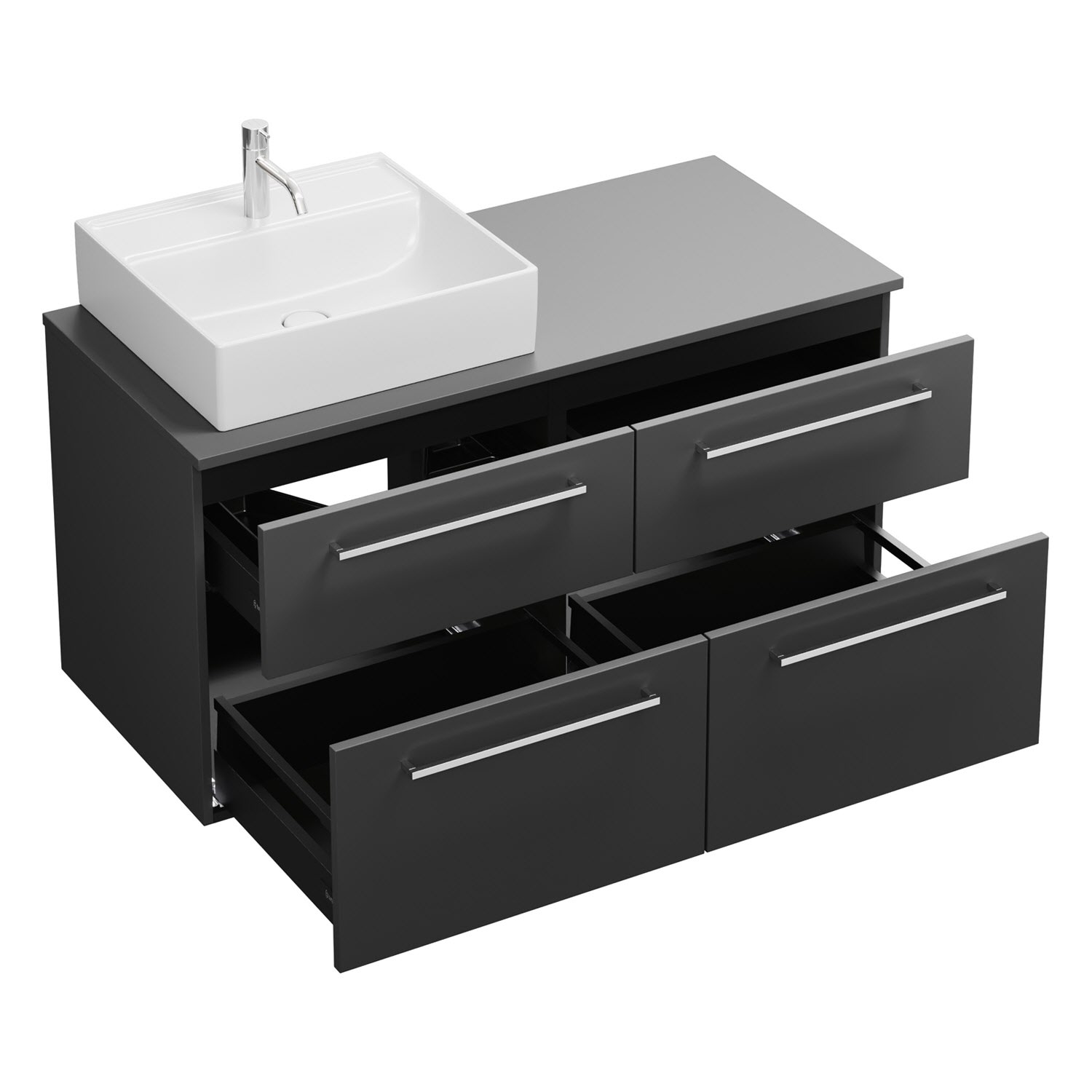 - 2 Schubladen oben, 35 cm tief, mit Siphonausschnitt und Inneneinteilung