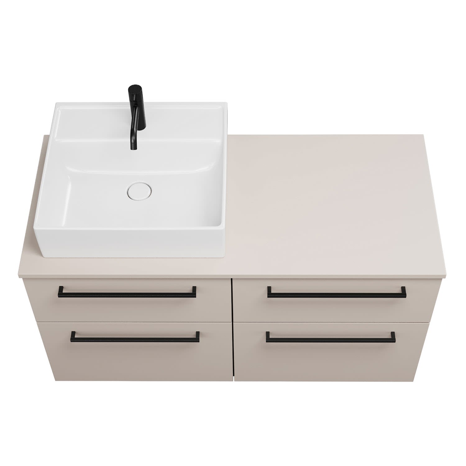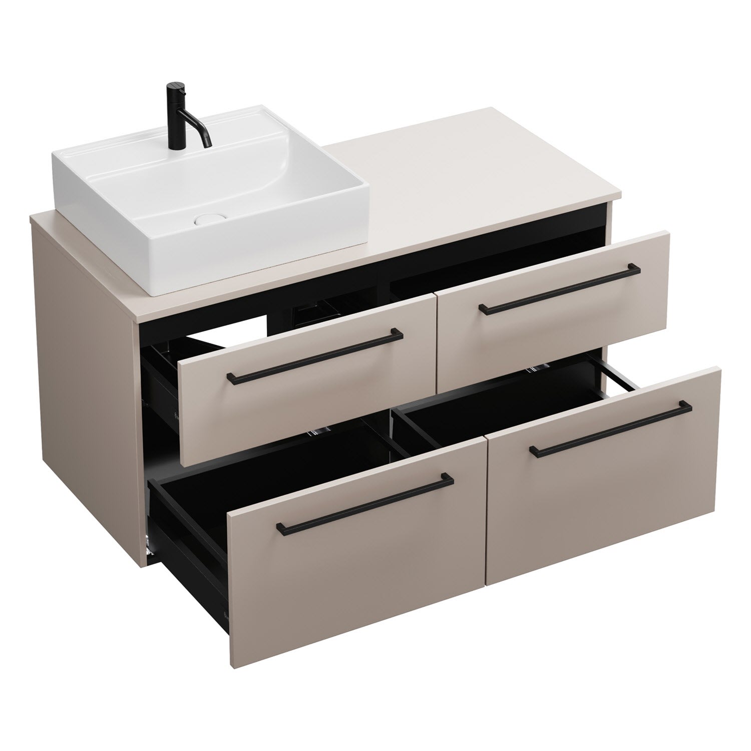 - 2 Schubladen oben, 35 cm tief, mit Siphonausschnitt und Inneneinteilung
