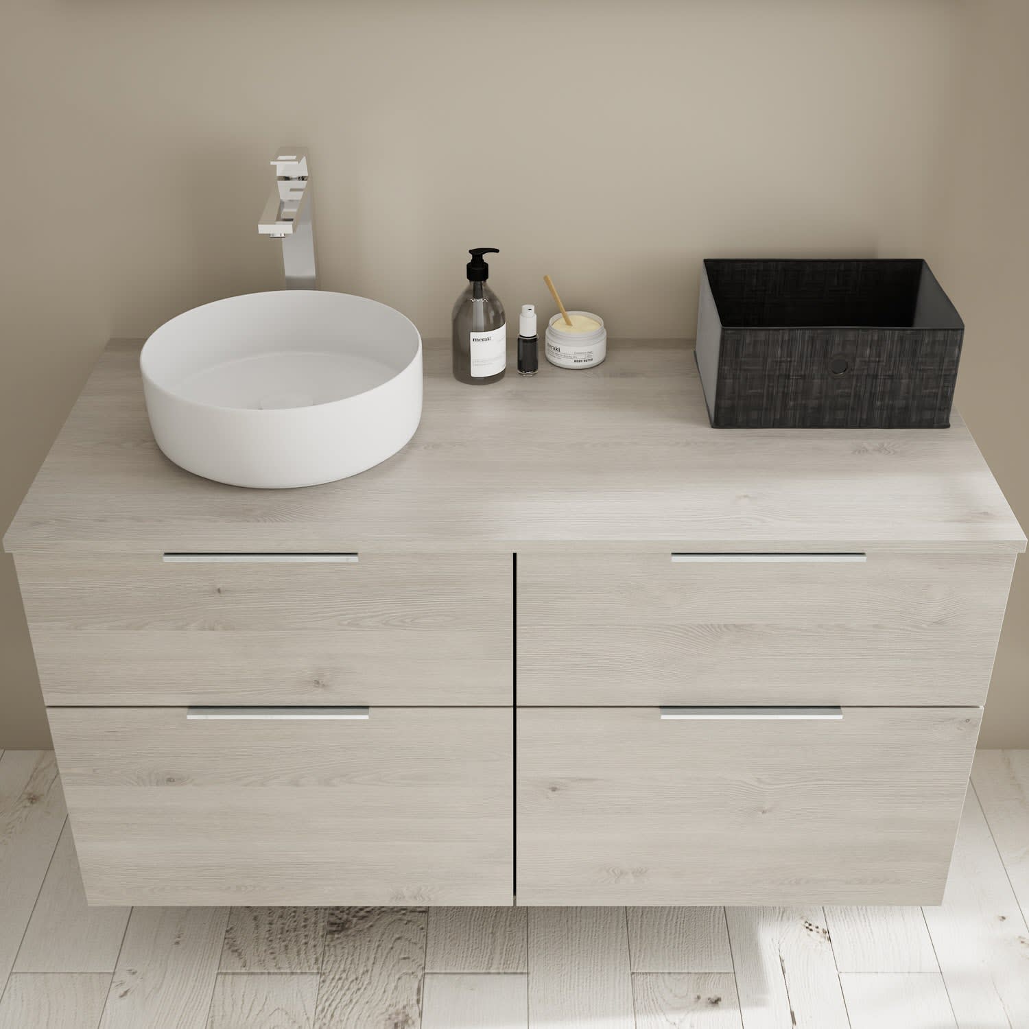 - 2 Schubladen oben, 35 cm tief, mit Siphonausschnitt und Inneneinteilung