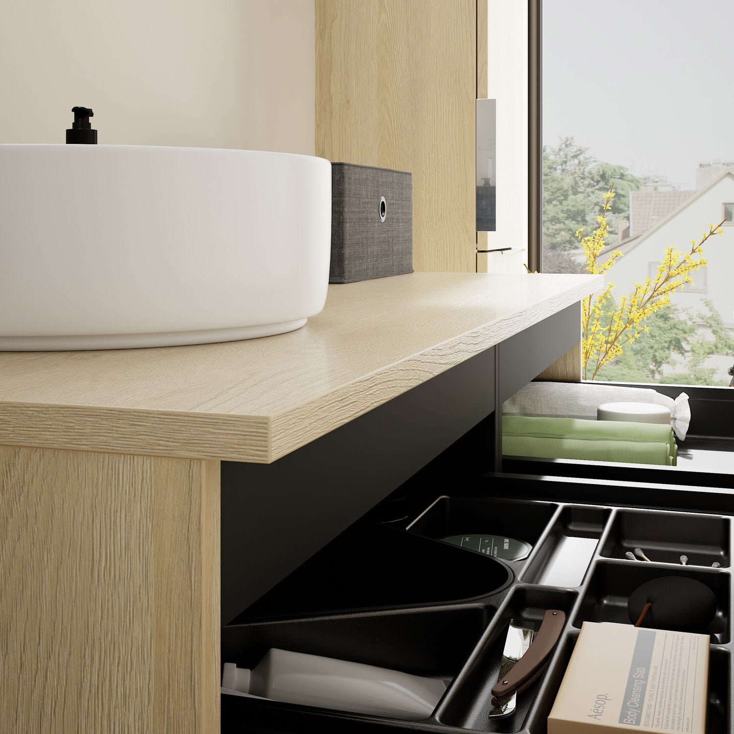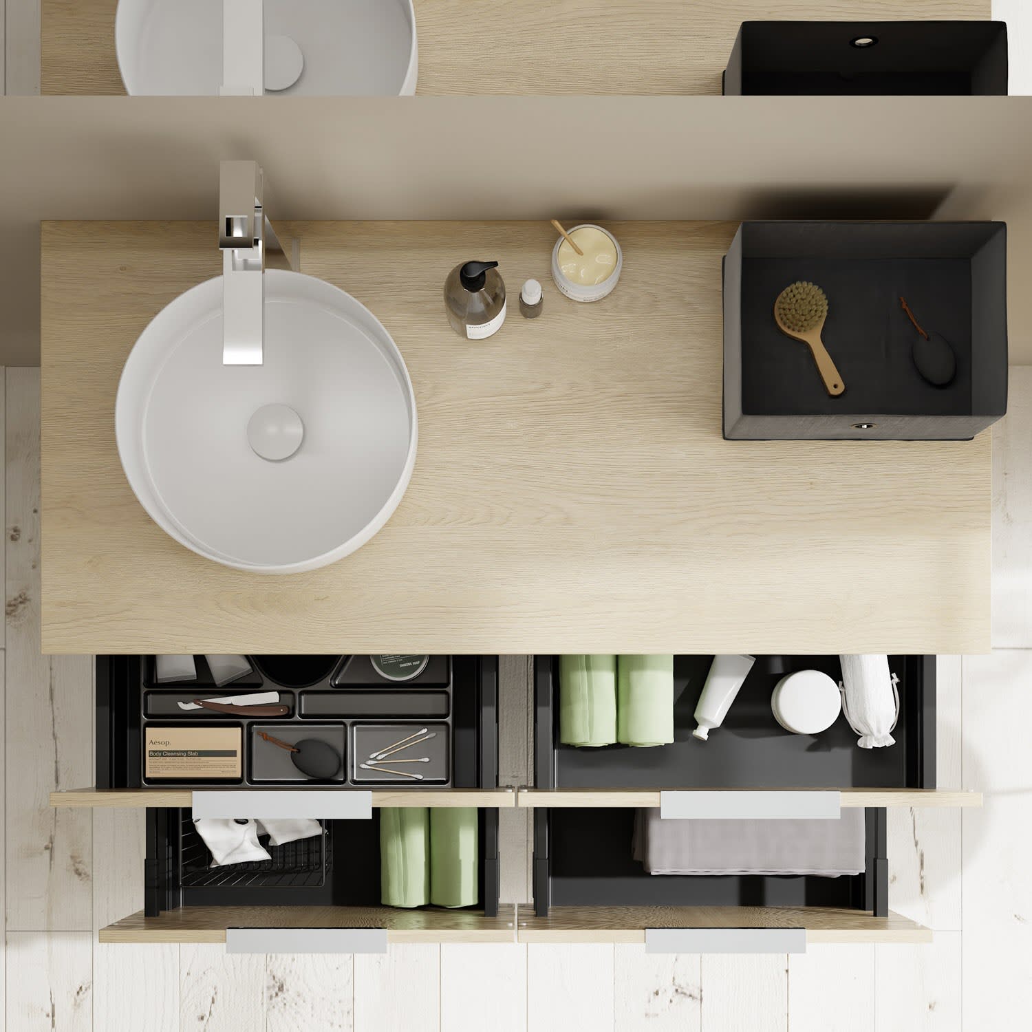 - 2 Schubladen oben, 35 cm tief, mit Siphonausschnitt und Inneneinteilung