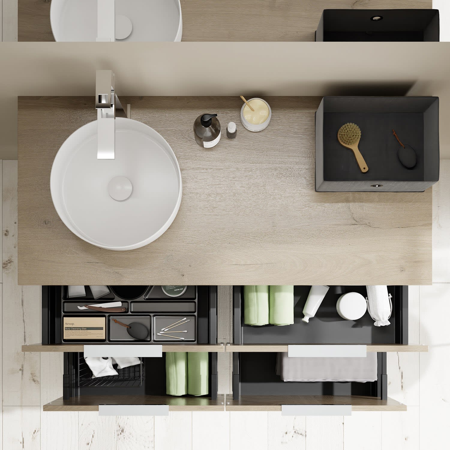 - 2 Schubladen oben, 35 cm tief, mit Siphonausschnitt und Inneneinteilung