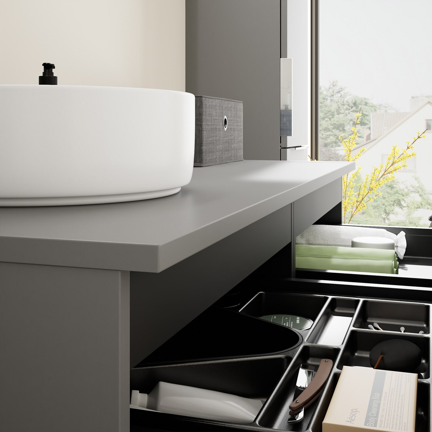 - 2 Schubladen oben, 35 cm tief, mit Siphonausschnitt und Inneneinteilung