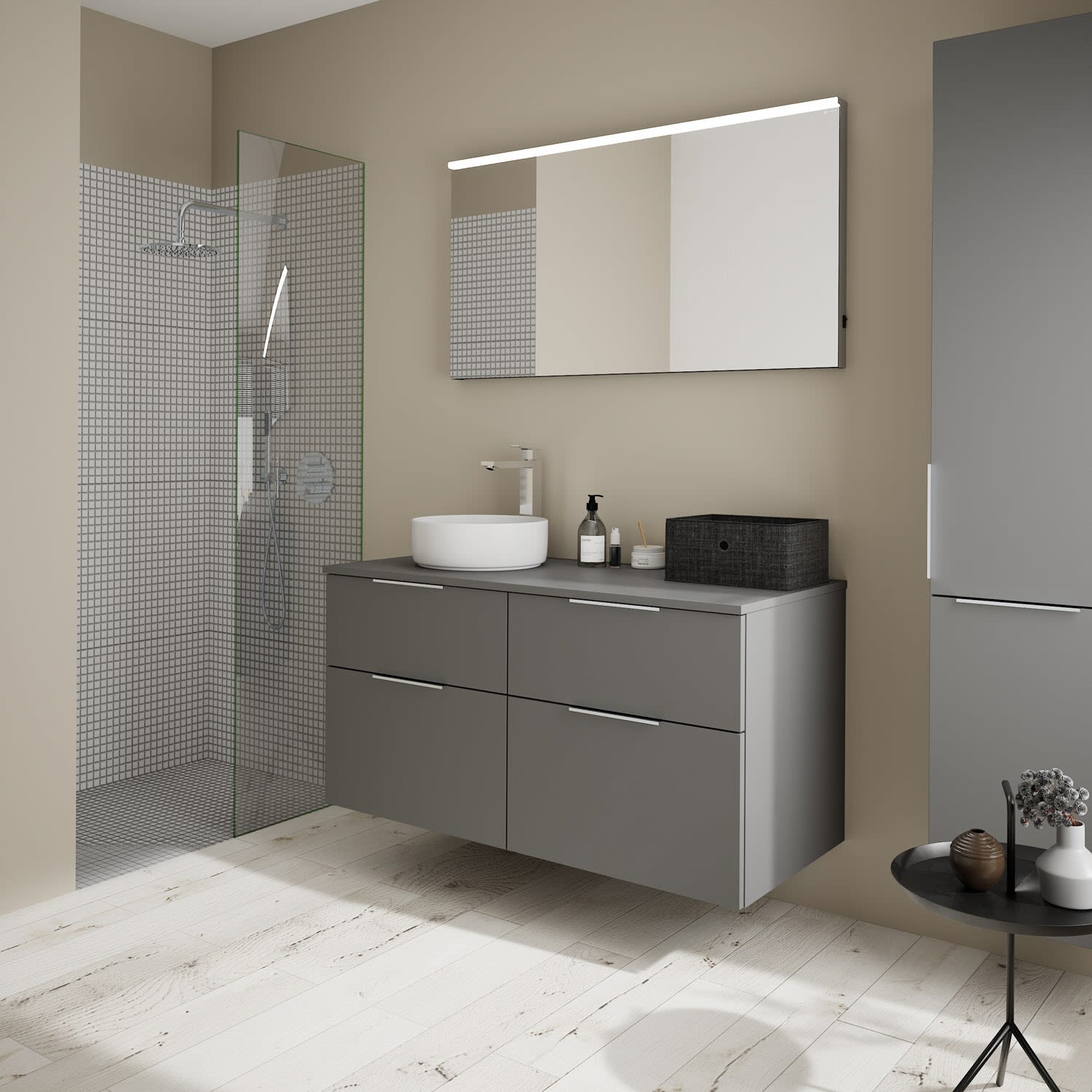 - Boden/Rückwand: Anthrazitgrau