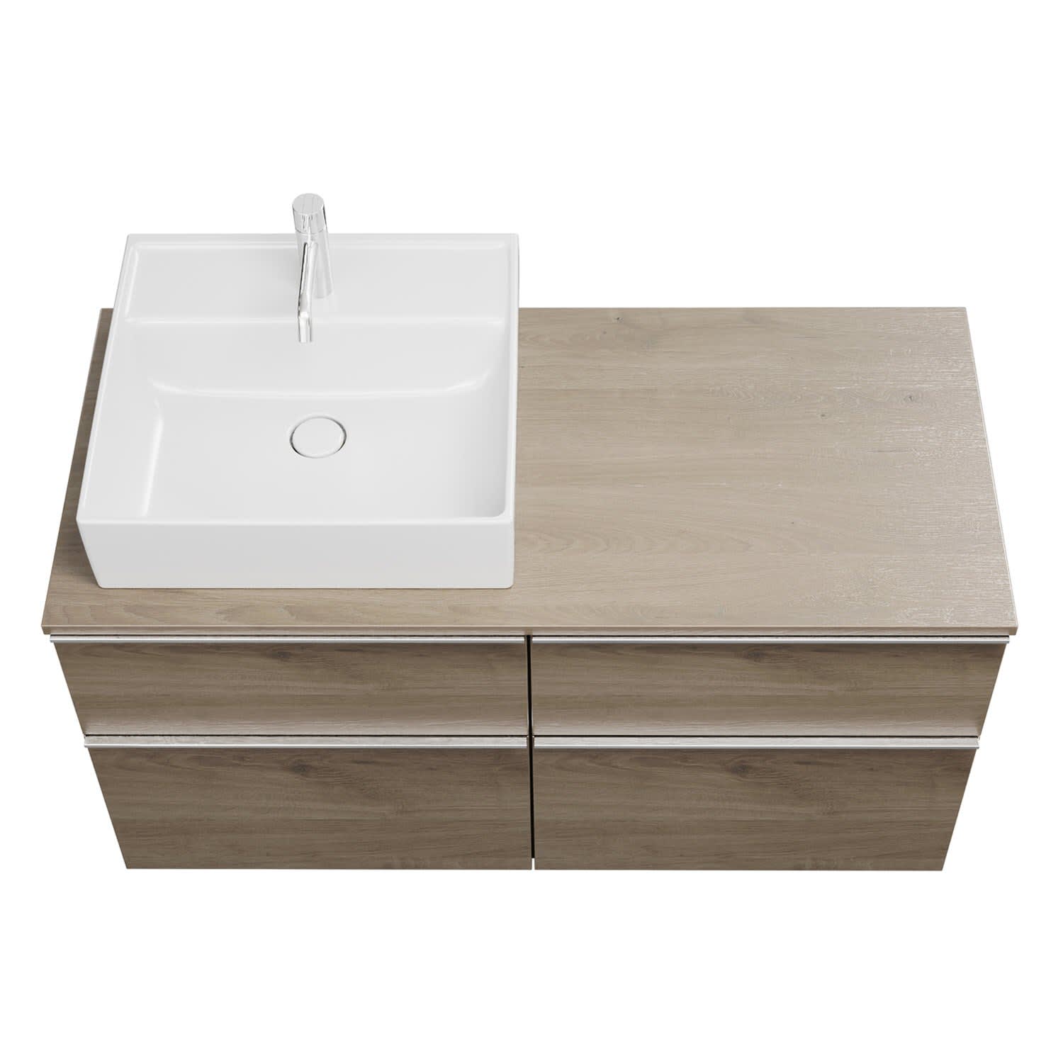 - 2 Schubladen oben, 35 cm tief, mit Siphonausschnitt und Inneneinteilung