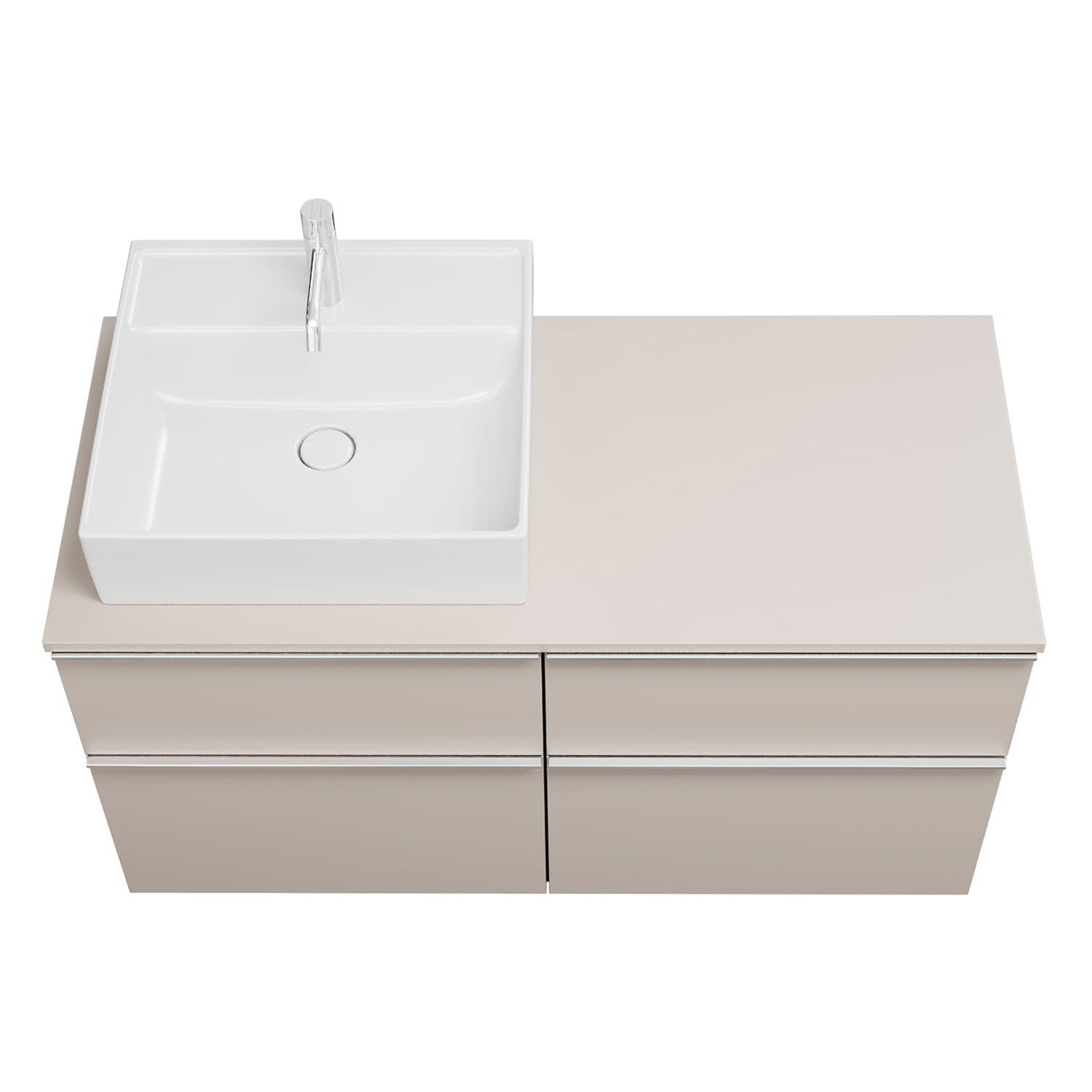 - 2 Schubladen oben, 35 cm tief, mit Siphonausschnitt und Inneneinteilung