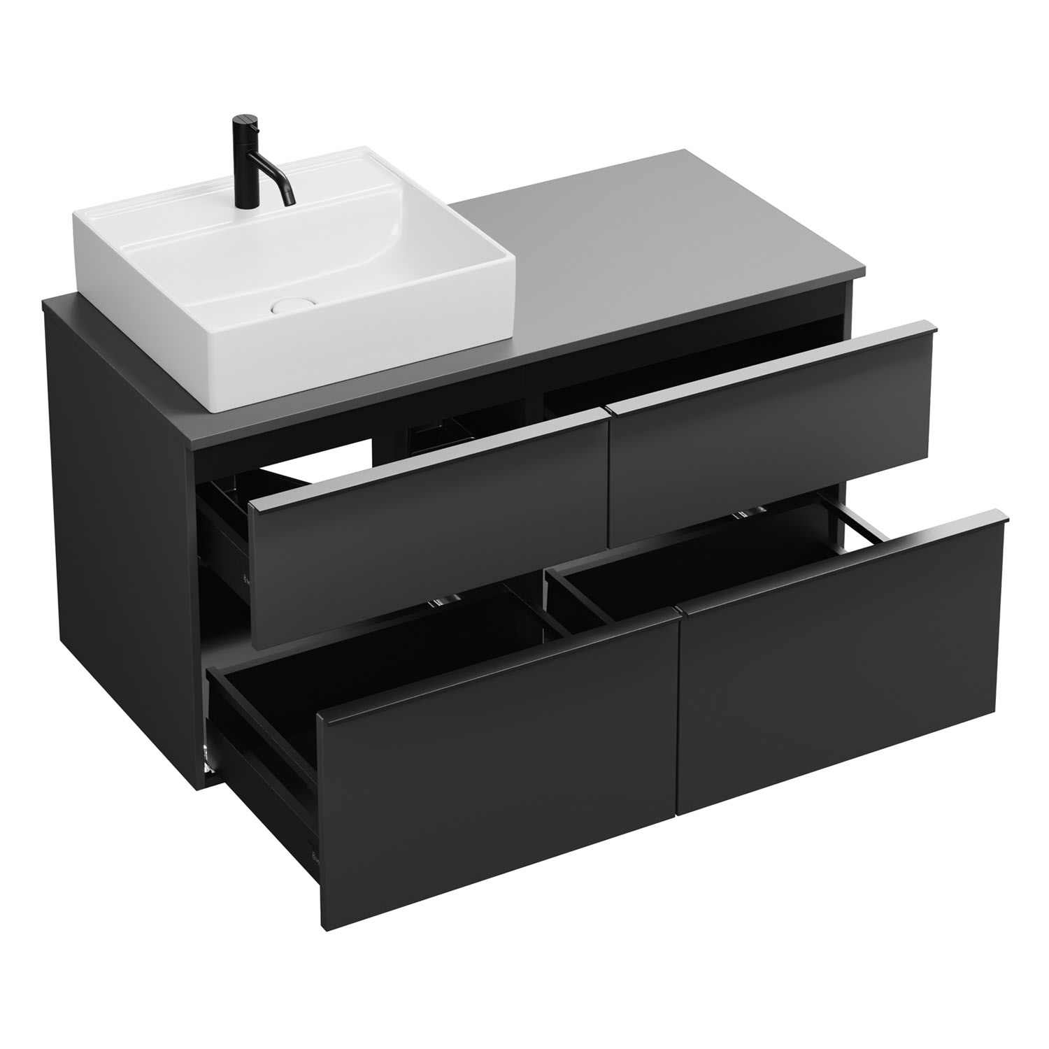 - 2 Schubladen oben, 35 cm tief, mit Siphonausschnitt und Inneneinteilung