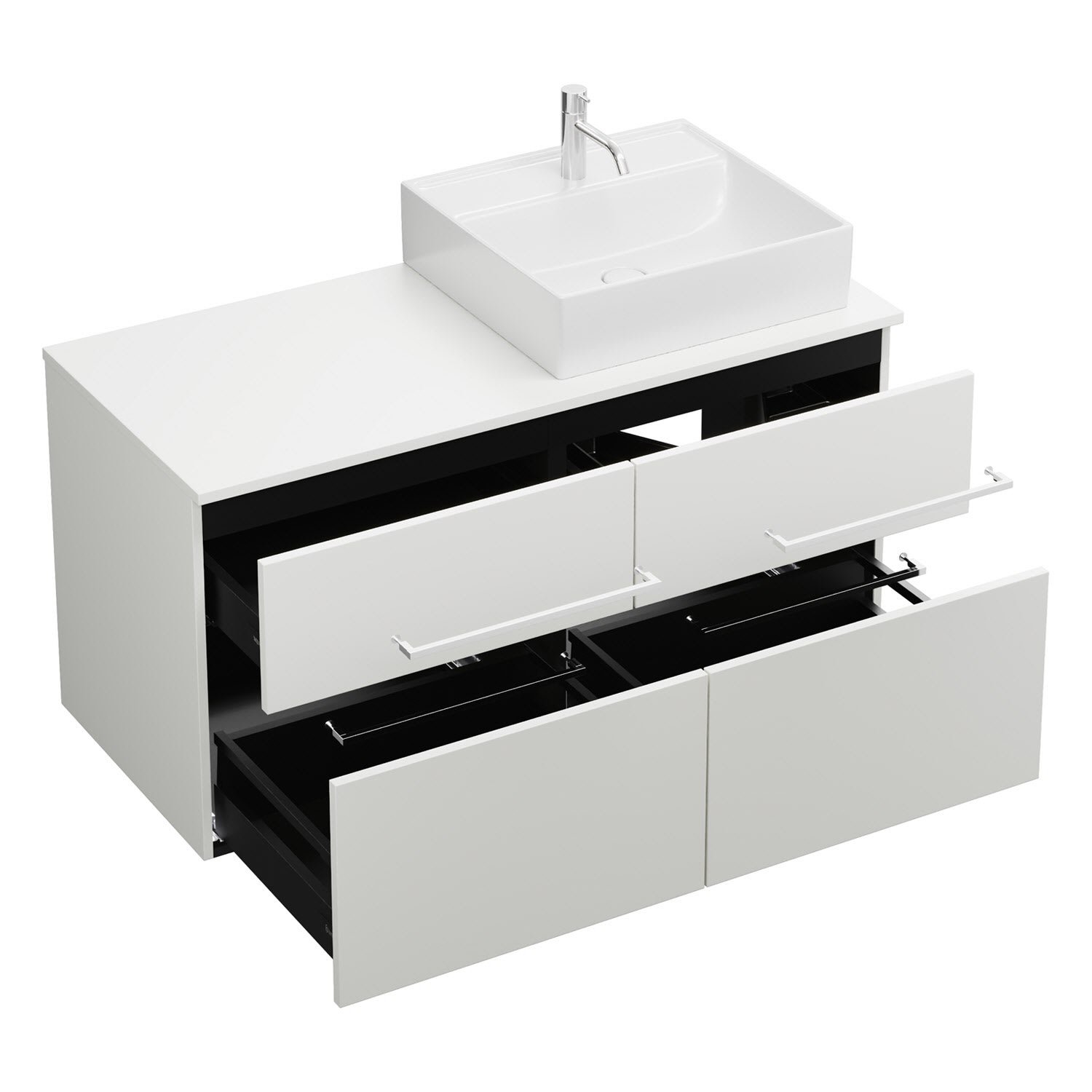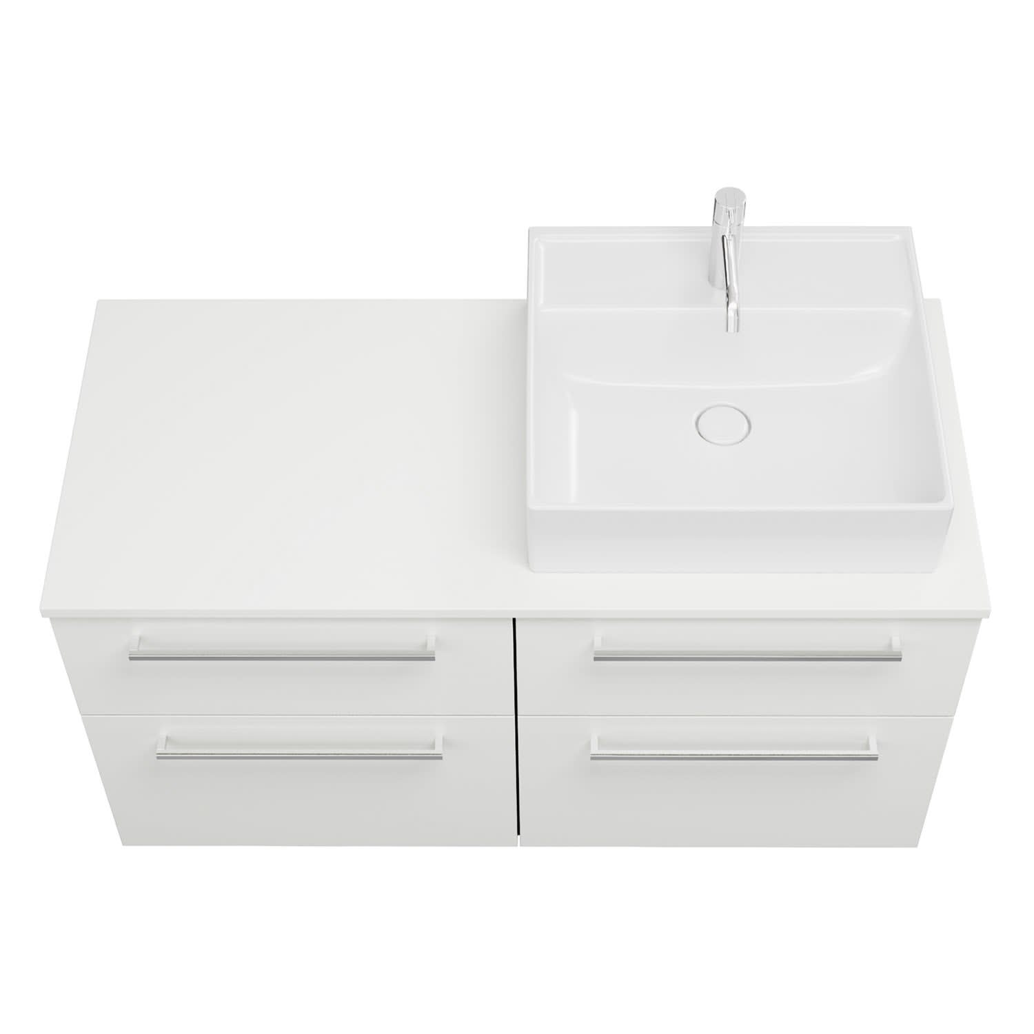 - 2 Schubladen oben, 35 cm tief, mit Siphonausschnitt und Inneneinteilung