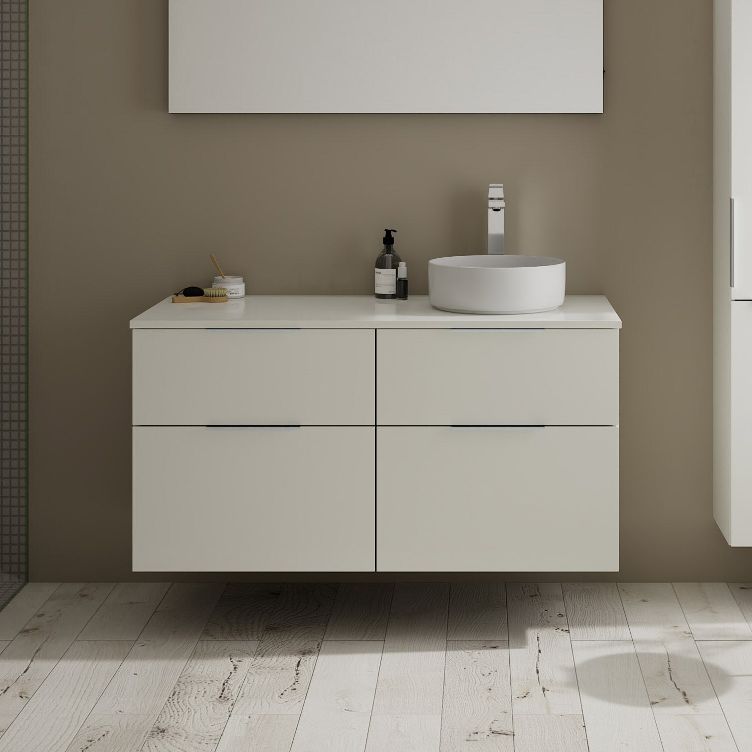 Aufsatzwaschtische müssen immer, mindestens 3 cm von den Außenkanten der Konsolenplatte entfernt sein.
